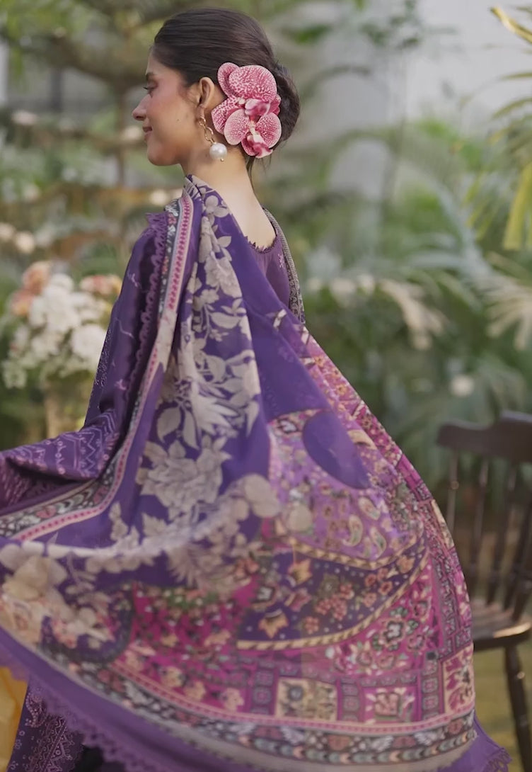 A regal reverie designed for unforgettable festivities. Cloaked in deep purple, the shirt is adorned with tonal embroidery that builds a refined, textural landscape through layered hues. The intricate detailing enhances its majestic appeal, while the vibrant printed chiffon dupatta introduces a striking contrast transforming the ensemble into a statement of elegance crafted for grand Eid soirées.