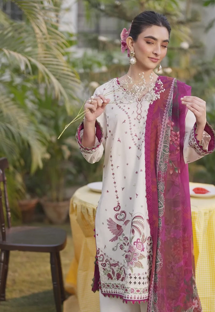 An ethereal expression of celebration and craft. The ivory shirt blooms with maroon, green, and light pink embroidery, enhanced by delicate organza inserts that lend depth and dimension to its artistry. Paired with a beautifully printed chiffon dupatta, this ensemble exudes refined charm, capturing a timeless yet distinctive elegance perfect for Eid festivities.