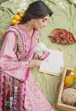 Soft as a festive dawn, radiant as a summer celebration. Rendered in tea pink, the shirt is adorned with tonal embroidery in varying pink hues, creating depth and texture that subtly glows under the Eid sun. The delicate craftsmanship enhances its feminine charm, while the beautifully printed chiffon dupatta flows effortlessly alongside—making this ensemble a graceful choice for warm gatherings and joyful reunions.