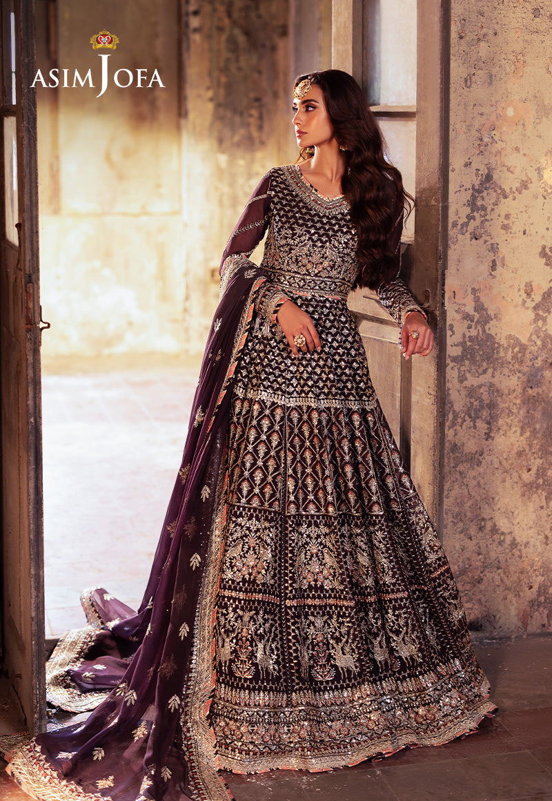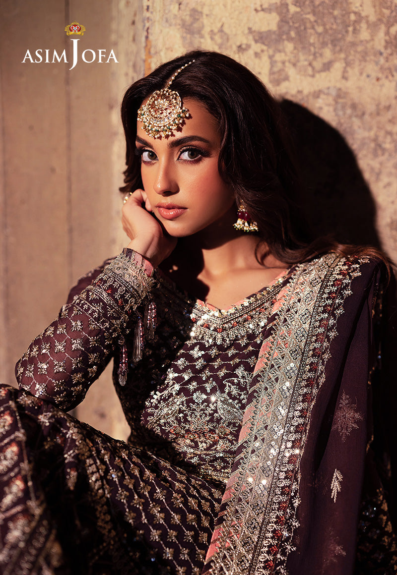 Cloaked in the regal hue of dark maroon, this ensemble is a masterpiece of intricate artistry. The embroidered Peshwas, a celestial canvas, is adorned with delicate light gold zariwork that gracefully winds through a constellation of shimmering 3mm cupped sequins, amidst an interconnected web of threads in maroon and peach hues. The embroidered dupatta, a celestial veil, completes this gorgeous ensemble, transforming the wearer into a vision of beauty.