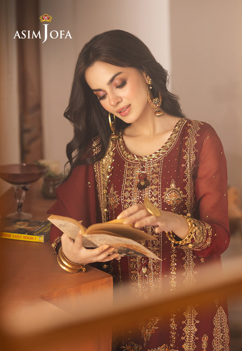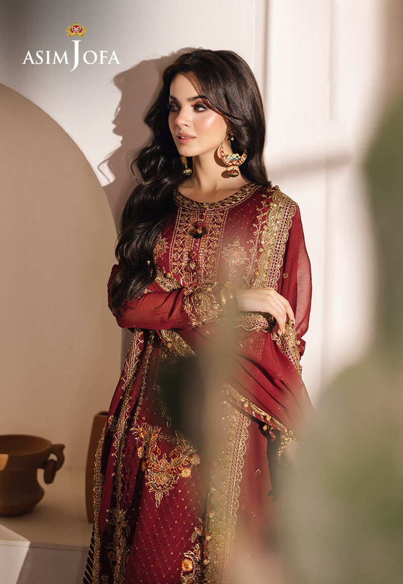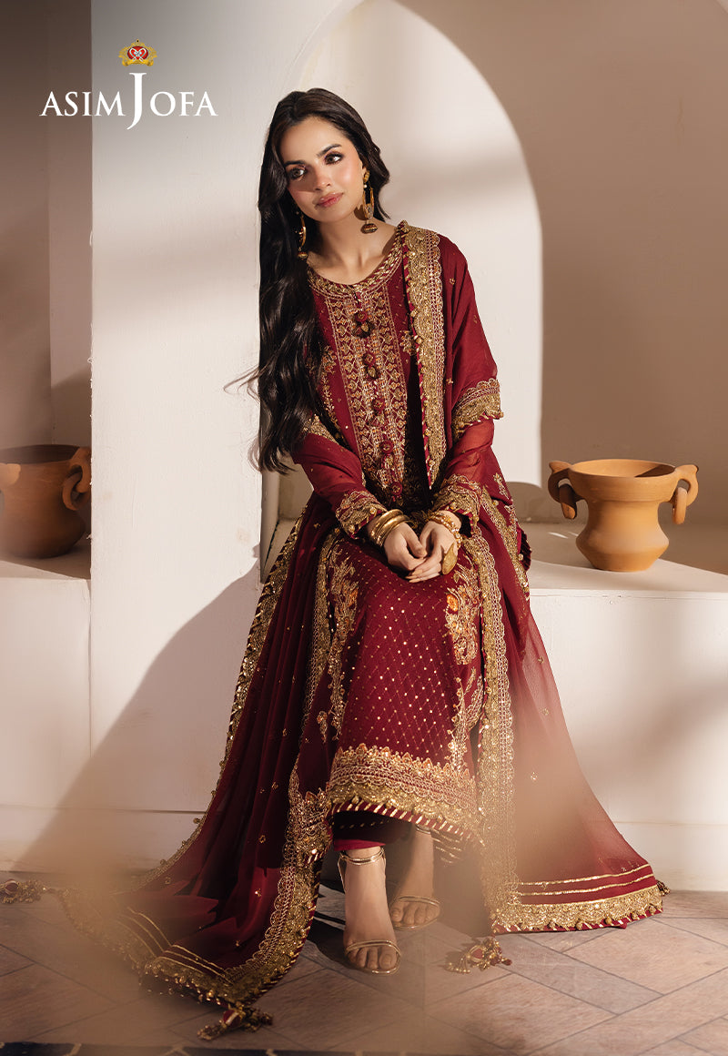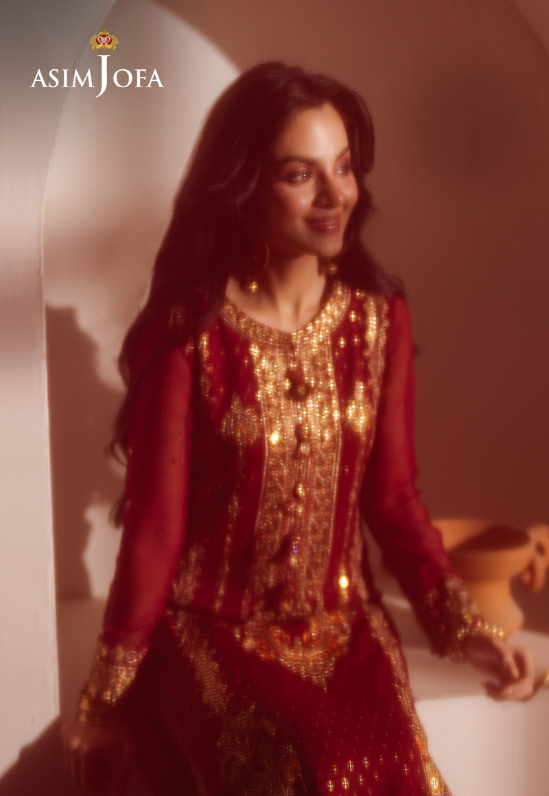 Drenched in the richness of deep red, this captivating ensemble is a testament to timeless elegance. The shirt is adorned with intricate rust threadwork that weaves tales of passion and artistry. Gold zari detailing adds a regal touch, shimmering like molten sunlight, while gold sequins scatter across the design, catching the light like radiant embers. The ensemble is completed with a gracefully embroidered chiffon dupatta, enhancing its allure and transforming it into a true statement of sophistication and charm.