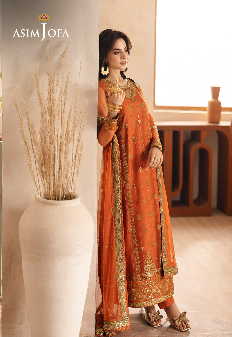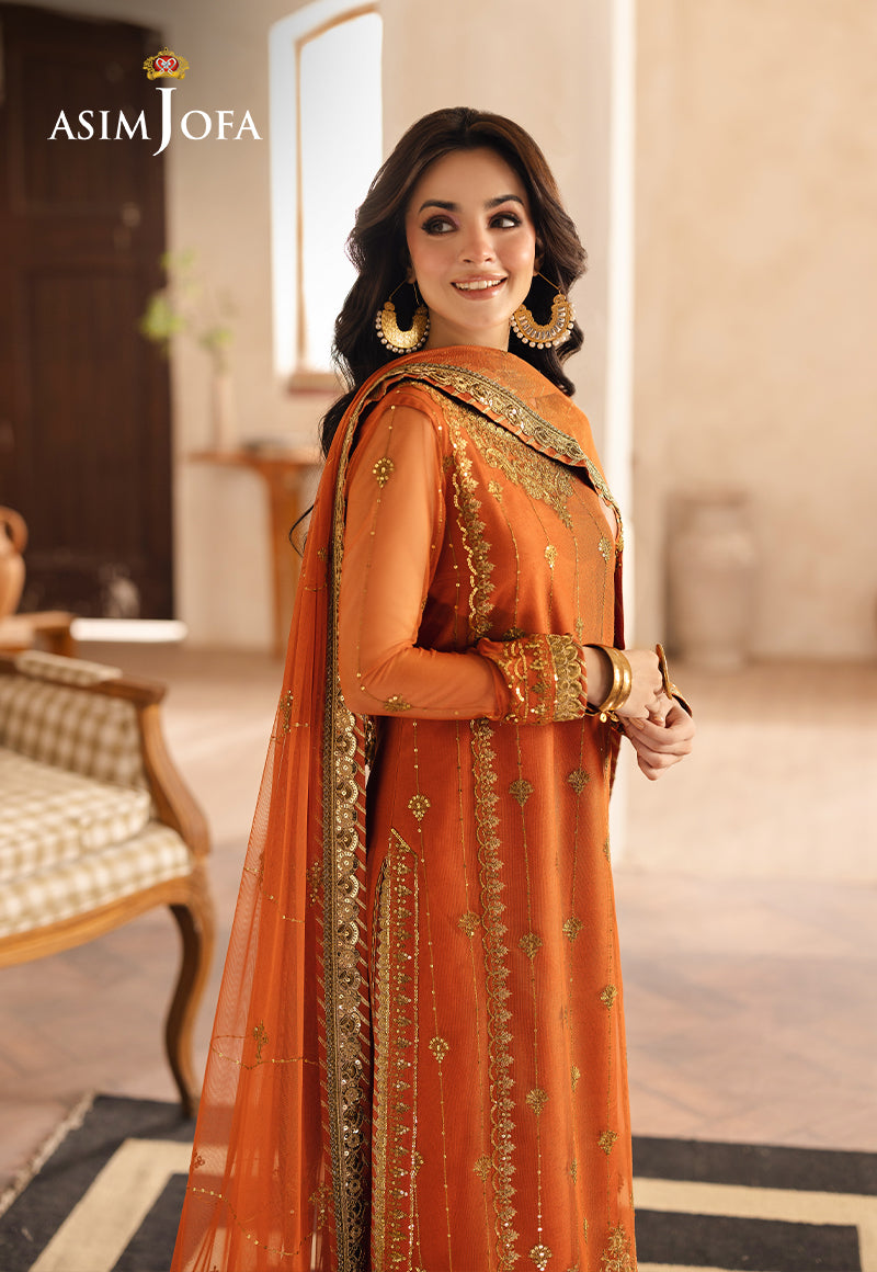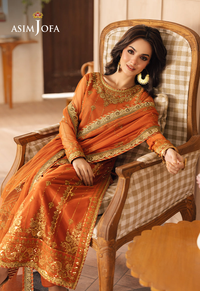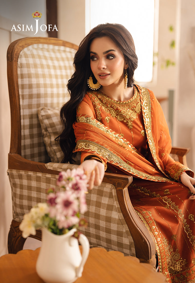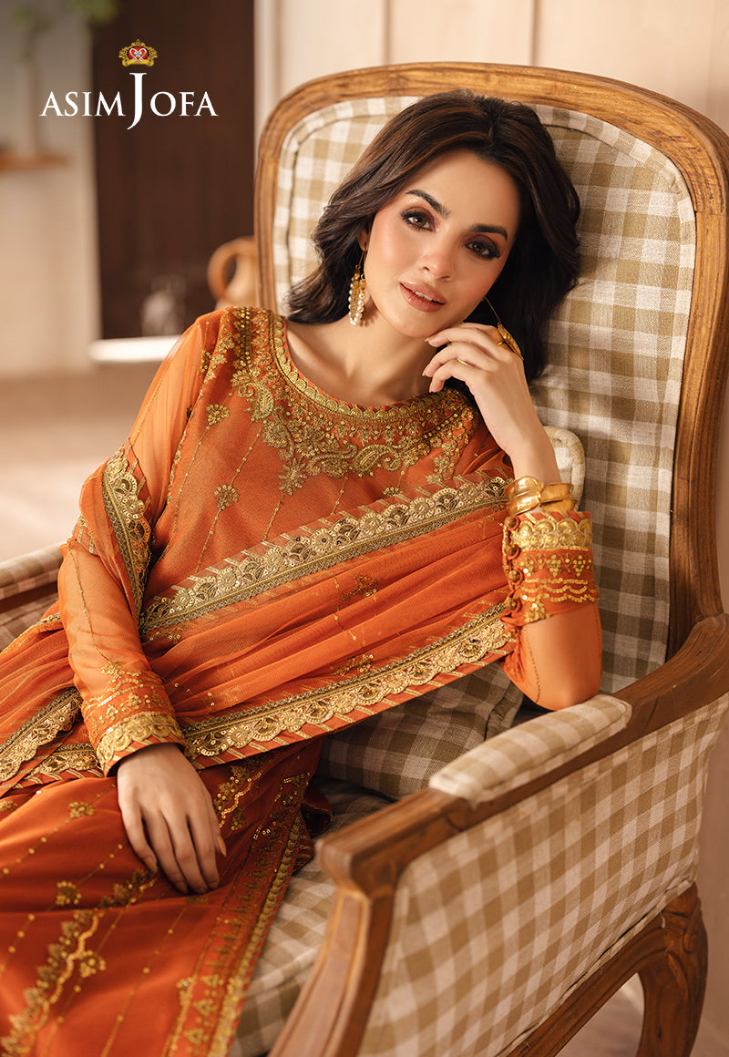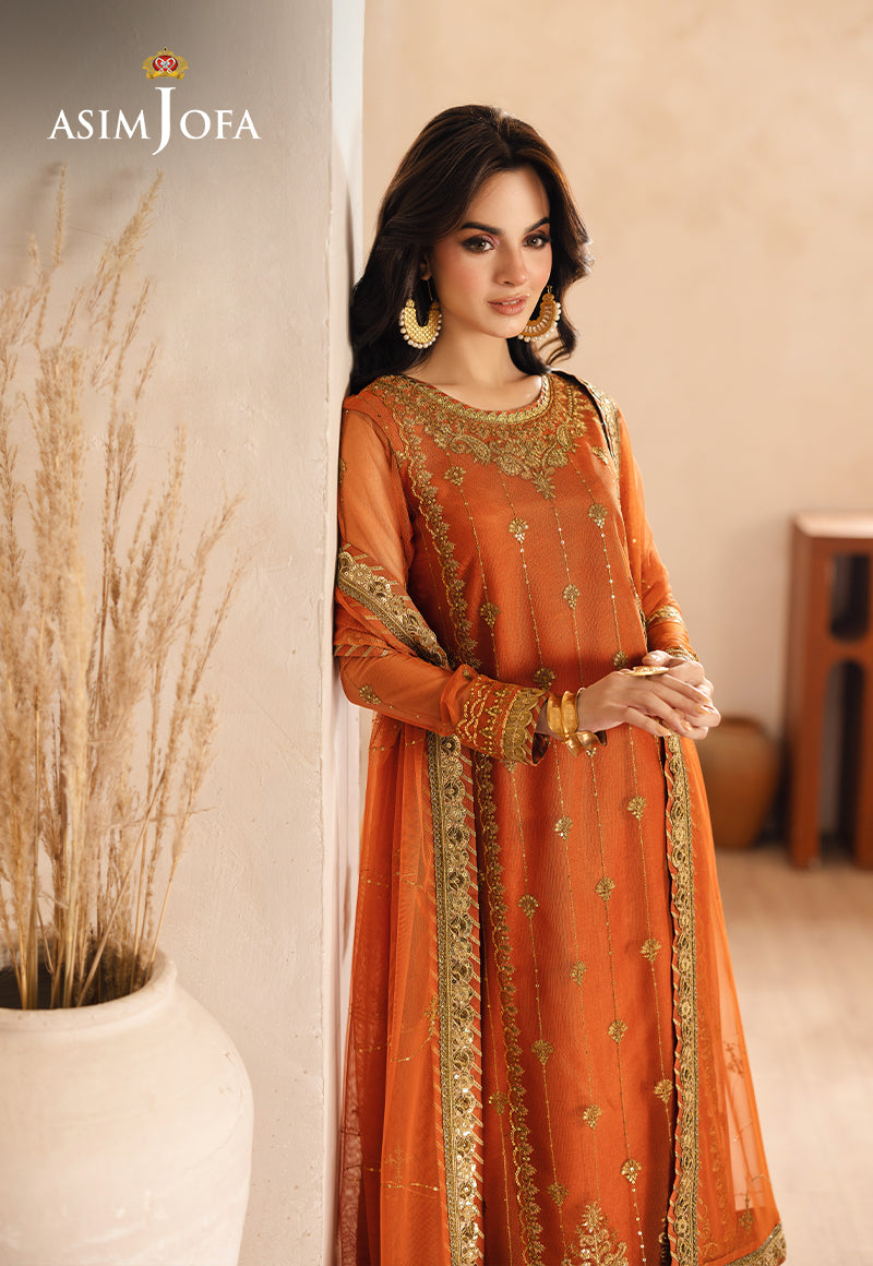 Bringing a burst of sunshine, this orange ensemble is adorned with two-toned gold zari that weaves patterns of radiant beauty. Gold sequins amplify the sparkle, making it a standout choice for any occasion. Completed with an elegantly embroidered dupatta, this design exudes a warm and lively charm.