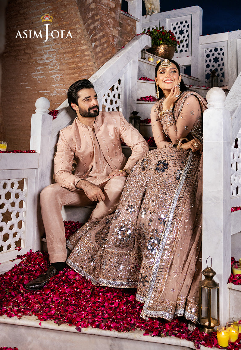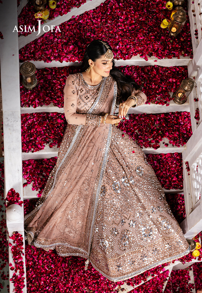 Behold the epitome of elegance with this pale tea-pink peshwas from Asim Jofa's "Jaan-e-Jahan Chiffon Collection" where artistry meets sophistication in a symphony of bronze copper zariwork and self-color threadwork along with silver plain 9mm and cupped 3mm sequins. The intricate florets of 9mm silver sequins encompassed with cupped 3mm sequins densely arranged on the ensemble creating a mesmerizing display of beauty and grace. The silver accents within the embroidery adds a touch of celestial magic and allure. Paired with a matching dupatta that mirrors the exquisite embroidery, this outfit is perfect for those who seek to make a graceful statement at formal occasions promising to captivate hearts and minds with its ethereal charm.
