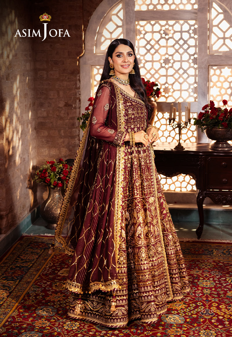 Embrace the beauty of traditional craftsmanship with this exquisite angrakha from Asim Jofa's "Jaan-e-Jahan Chiffon Collection" featuring luxurious gold cupped 3mm sequins along with antique gold zariwork on maroon fabric. The elaborate golden motifs are inspired by cultural elements which adorns the entire outfit creating a regal and opulent look. Floral design and geometric pattern add a timeless touch to the ensemble. The maroon backdrop serves as a striking contrast to the shimmering gold details making it both eye-catching and elegant. With its intricate embroidery and warm color palette, this anghrakha evokes a sense of majesty making it an ideal choice for those who value elegance and cultural heritage.