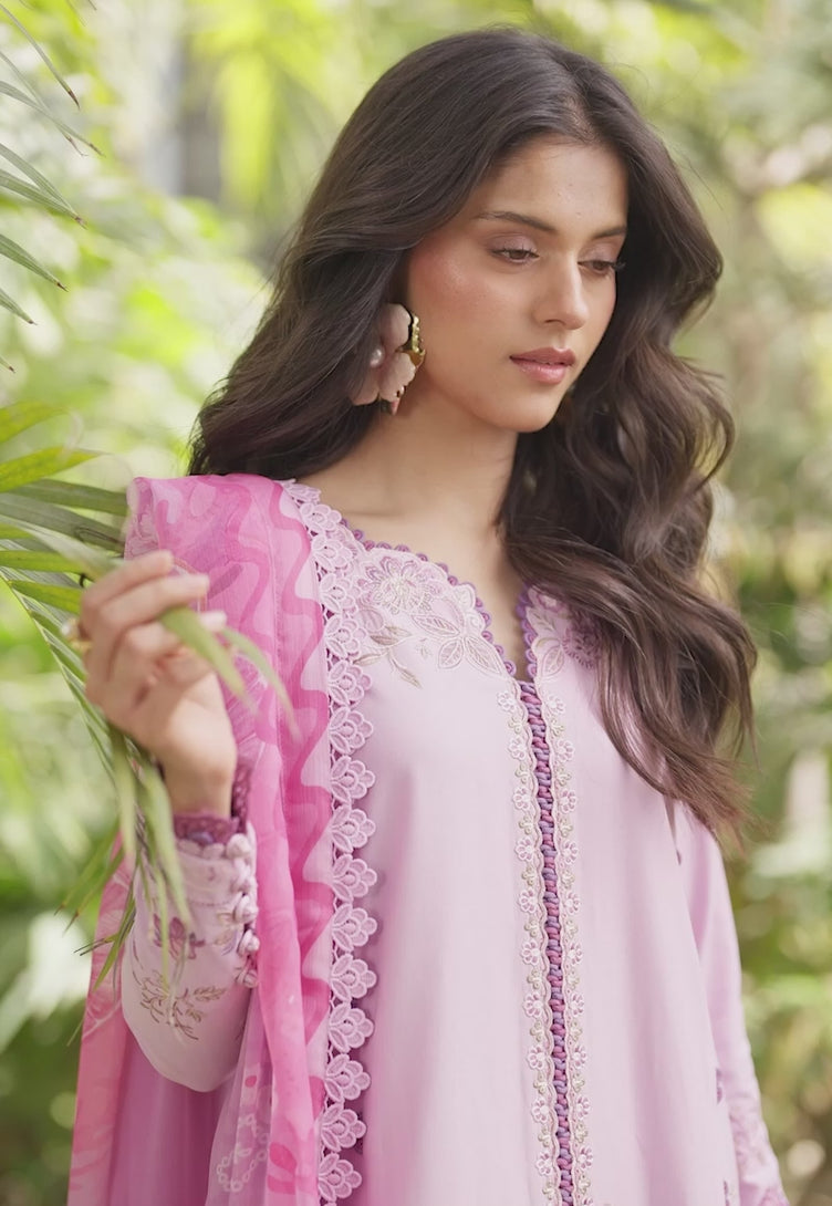 A celebration of color imbued with playful elegance. Embroidered with pink, purple, and mint threads, the light pink shirt blossoms with a youthful yet refined charm. The intricate detailing enhances its soft femininity, while the stunning printed chiffon dupatta introduces a vibrant flourish creating a look that feels both delicate and spirited, perfect for joyous Eid moments.