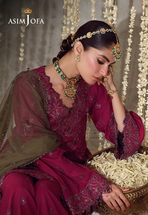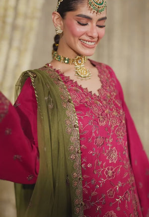 Reminiscent of a heritage painting brought to life, this magenta pink outfit tells its story through intricate detail. The angrakha style shirt is adorned with antique gold zari and sequins, intertwined with mehndi green and pink threadwork that spreads across the fabric in a seamless flow. The richness of its all-over embroidery is softened by a minimally adorned trouser, allowing the shirt to remain the focal point. A contrasting green dupatta, embroidered with precision, completes the narrative with a sense of cohesion and refined grandeur.