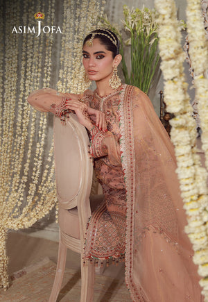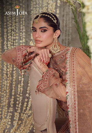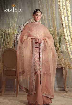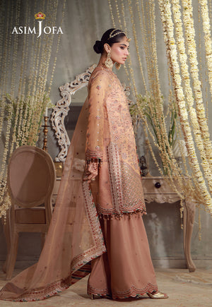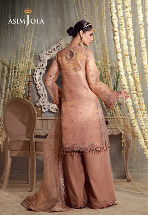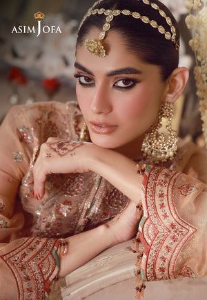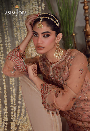 Evoking the ethereal glow of a sun-drenched horizon, this ensemble radiates a warm, understated majesty that captures the very essence of golden hour. The dark peach canvas is lavishly adorned with champagne zari and sequins, creating a soft luminescence that is further enriched by deep rust and verdant green threadwork for a multi-dimensional finish. Exquisite scalloped edges trace the borders and sleeves, lending a fluid movement and artisanal finesse to the structured silhouette. Complemented by minimally embroidered trousers and a dupatta of breathtaking detail, the look stands as a masterpiece of refined festive charm and timeless elegance.