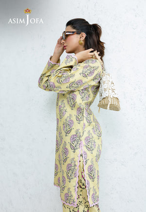 With a soft light yellow base, this ensemble radiates warmth and finesse. The shirt is adorned with a seamless motif print, while the trousers feature a distinct yet coordinated design — creating a balanced, fashion-forward look perfect for sunny afternoons.