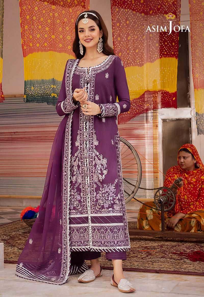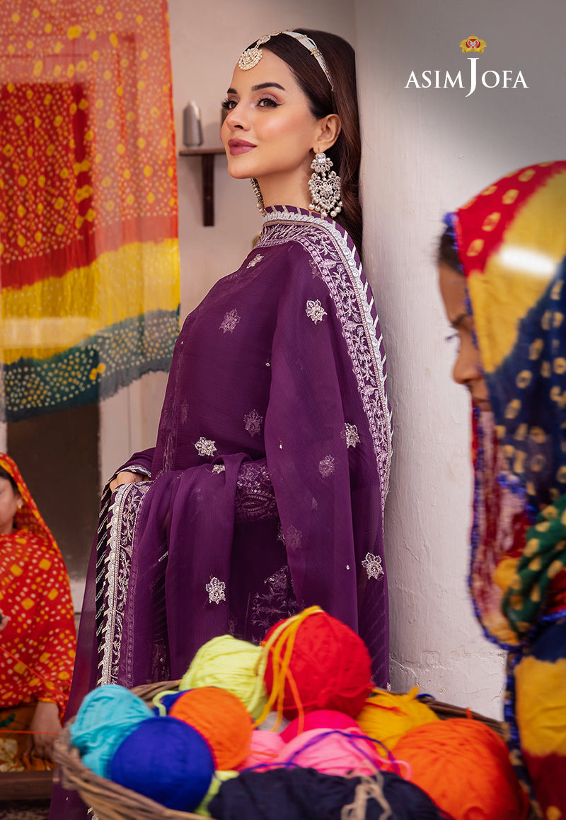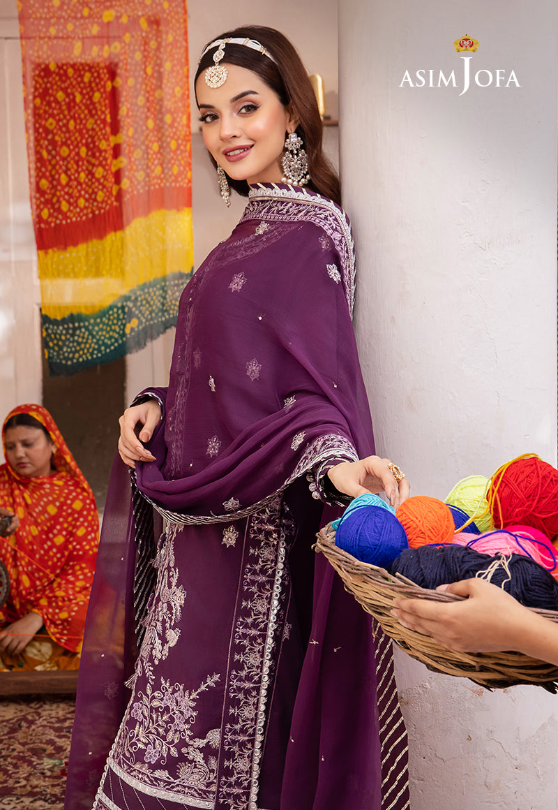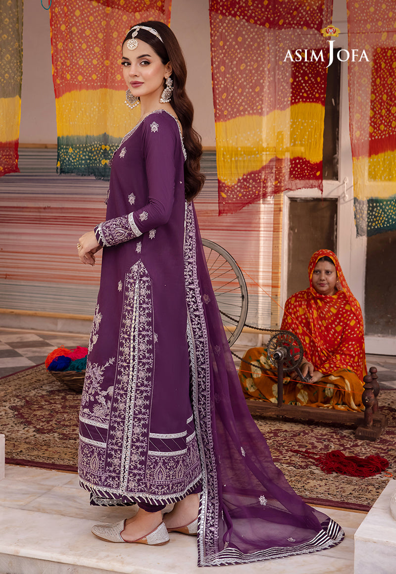 Komal Meer graces us with a royal regalia in the Purple ensemble from Asim Jofa's 'Abresham Collection.' It seems as if the fabric has been adorned with threads of luxury, featuring intricate threadwork, silver zari work, and sequins that create an opulent tapestry. The 9mm sequins, cascading from neckline to hem and embellishing the borders of the shirt and dupatta, transforms this attire into a true masterpiece fit for royalty.