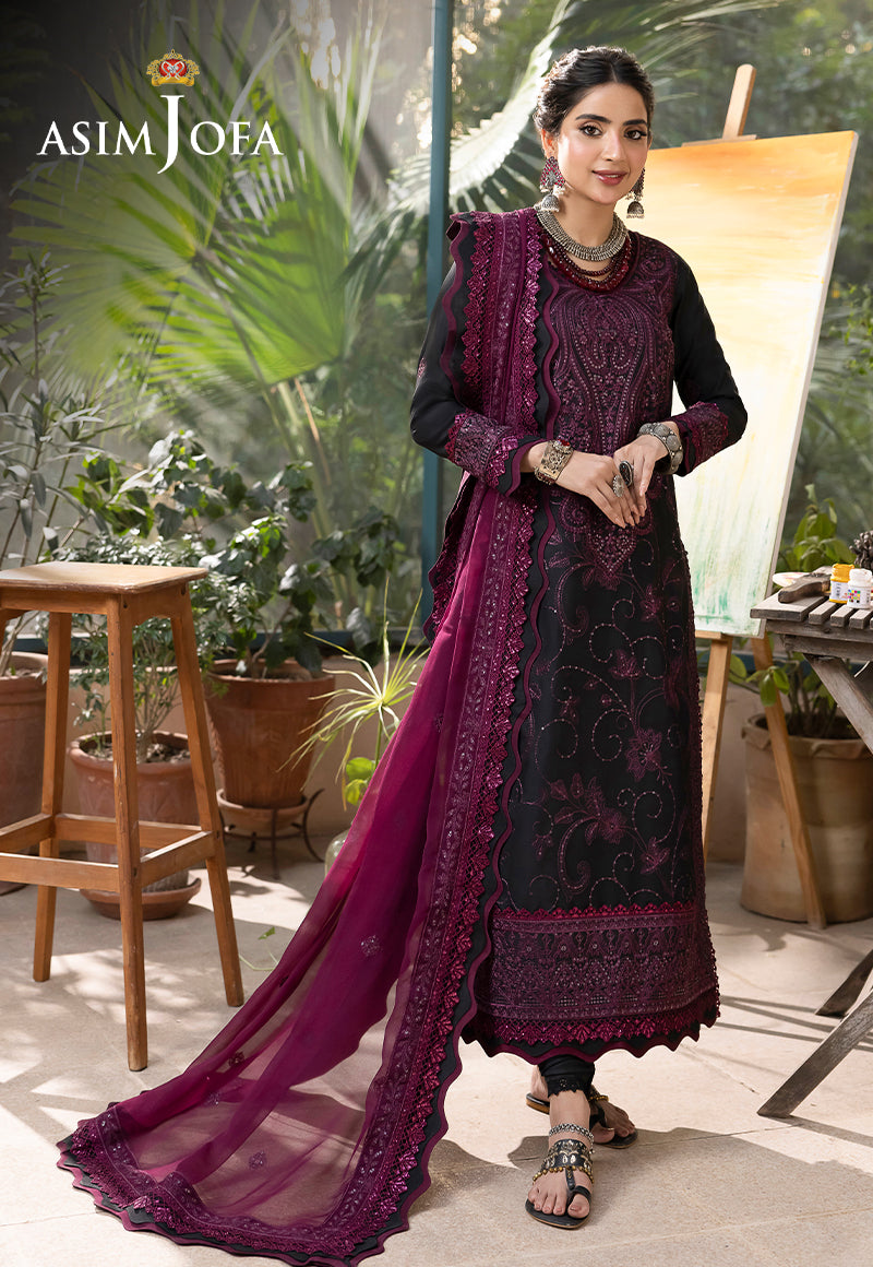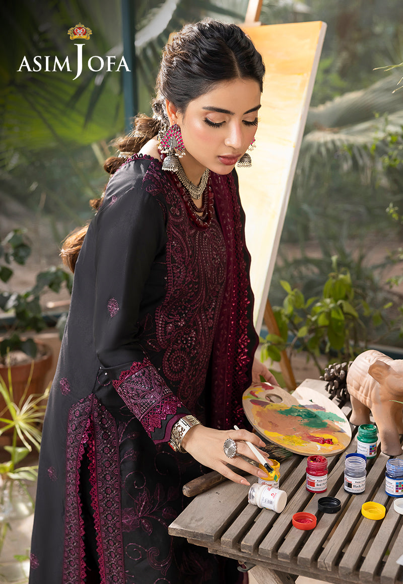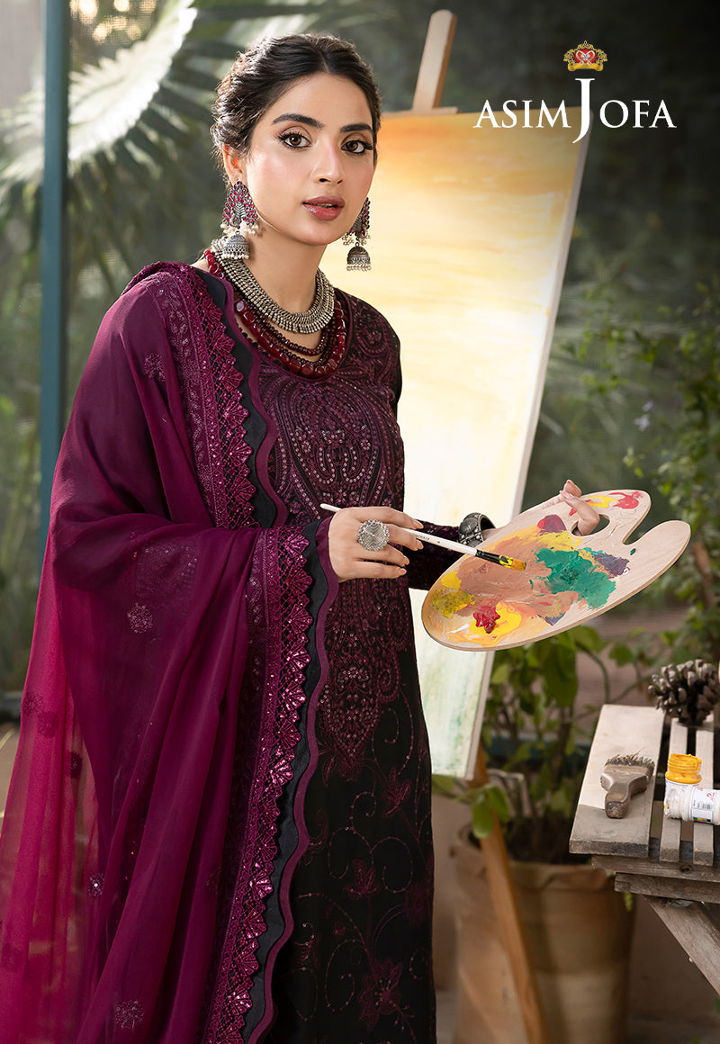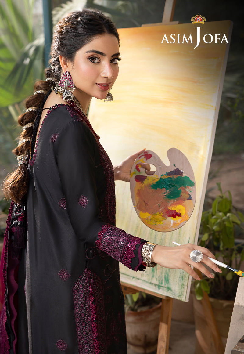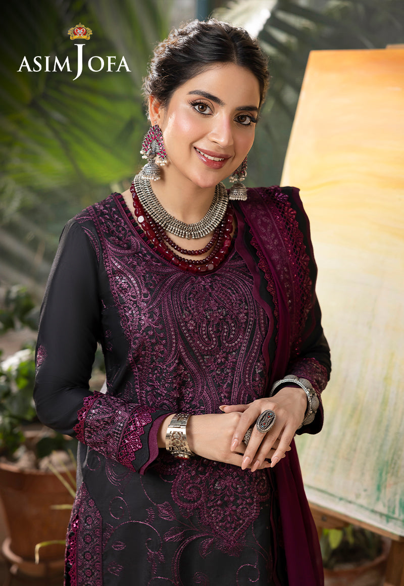 Immerse yourself in the luxury of 'Shadow Work' as it intertwines with the legacy of ancient craftsmanship. Saboor Aly embodies the essence of tradition and sophistication. Maroon embroidery upon a black canvas unfurls like the strokes of a classic painting, each thread telling a story of heritage. Sequins, akin to the glint of stars against an inky sky, bestow luminous elegance upon the fabric. This ensemble, reminiscent of an heirloom tapestry, bridges eras, embodying the charm of history while embracing modern sensibilities