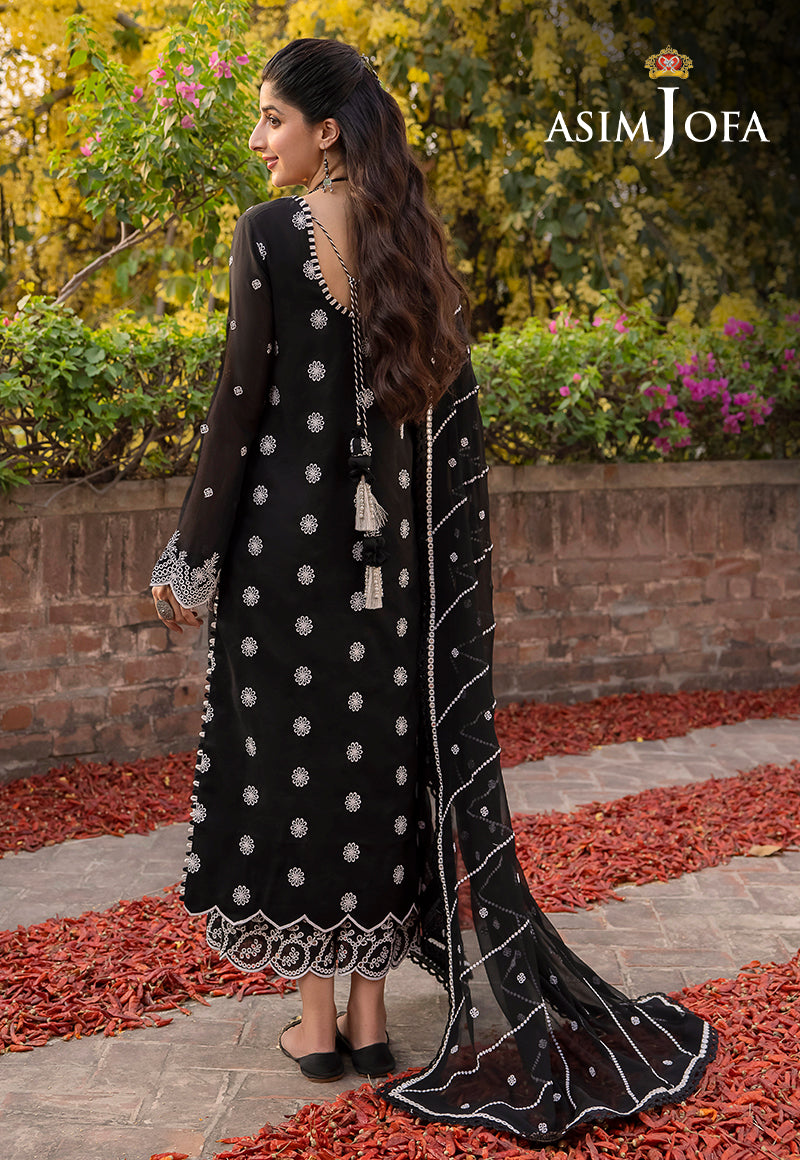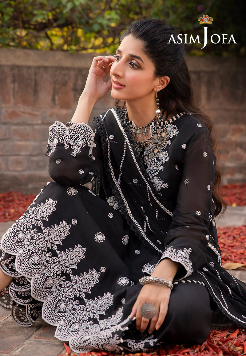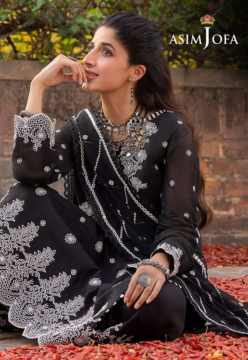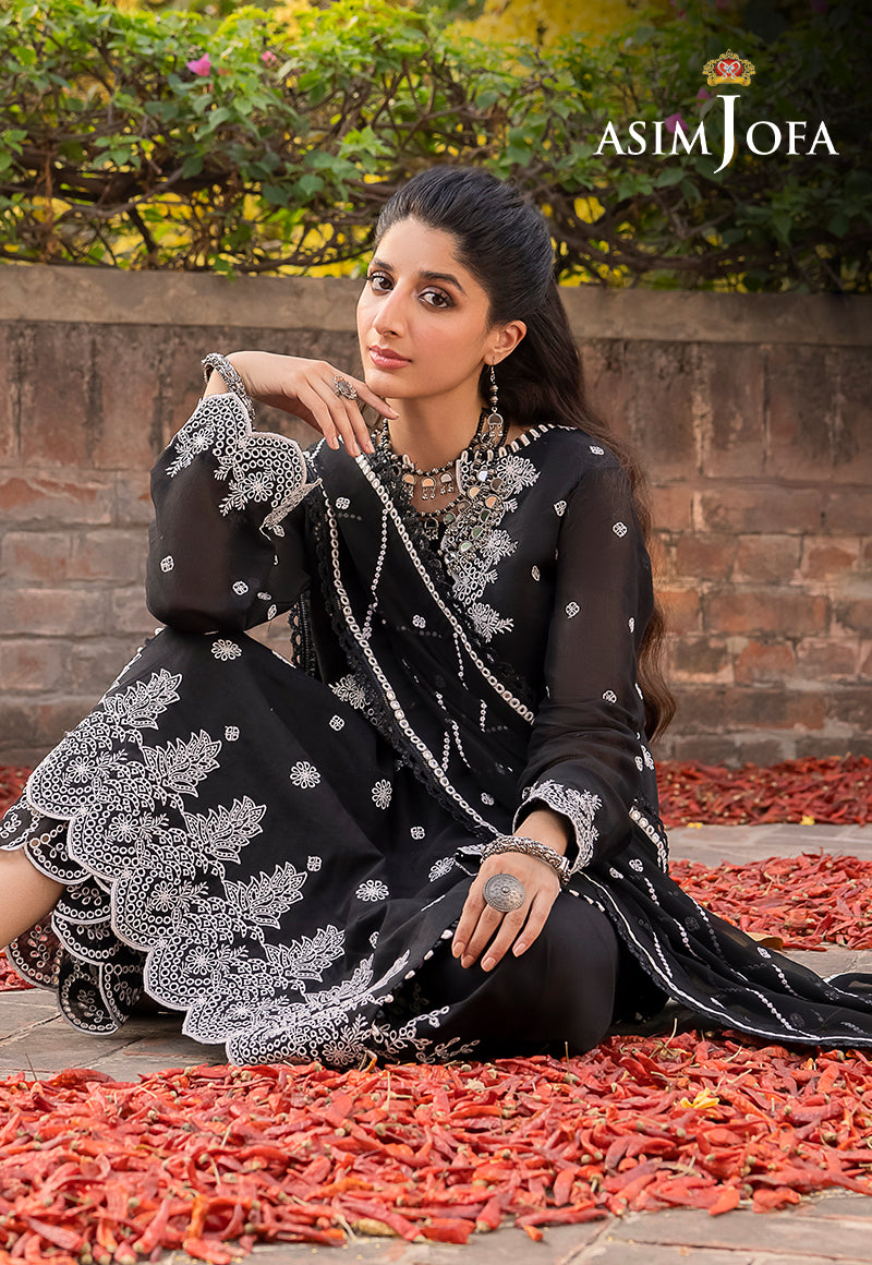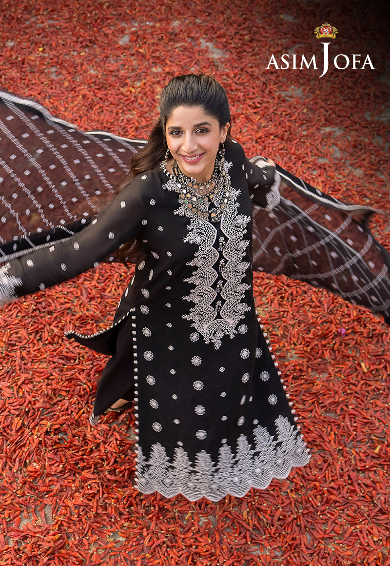 Asim Jofa's "Shadow Work" collection, as worn by model Mawra Hocane, becomes an epitome of elegance draped in an ensemble that mirrors the mysteries of the night sky. This monochromatic marvel, shrouded in black and adorned with white arabesque embroidery, is reminiscent of stars twinkling against a nocturnal canvas. The ensemble's beautiful sleeves and borders resemble constellations, while the breathtaking neckline and dupatta, kissed by diagonal stripes, capture the ethereal beauty of shooting stars.