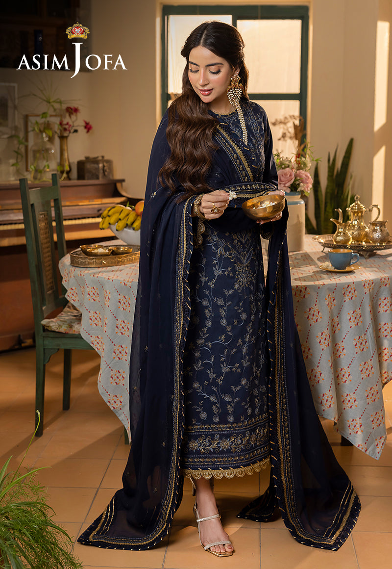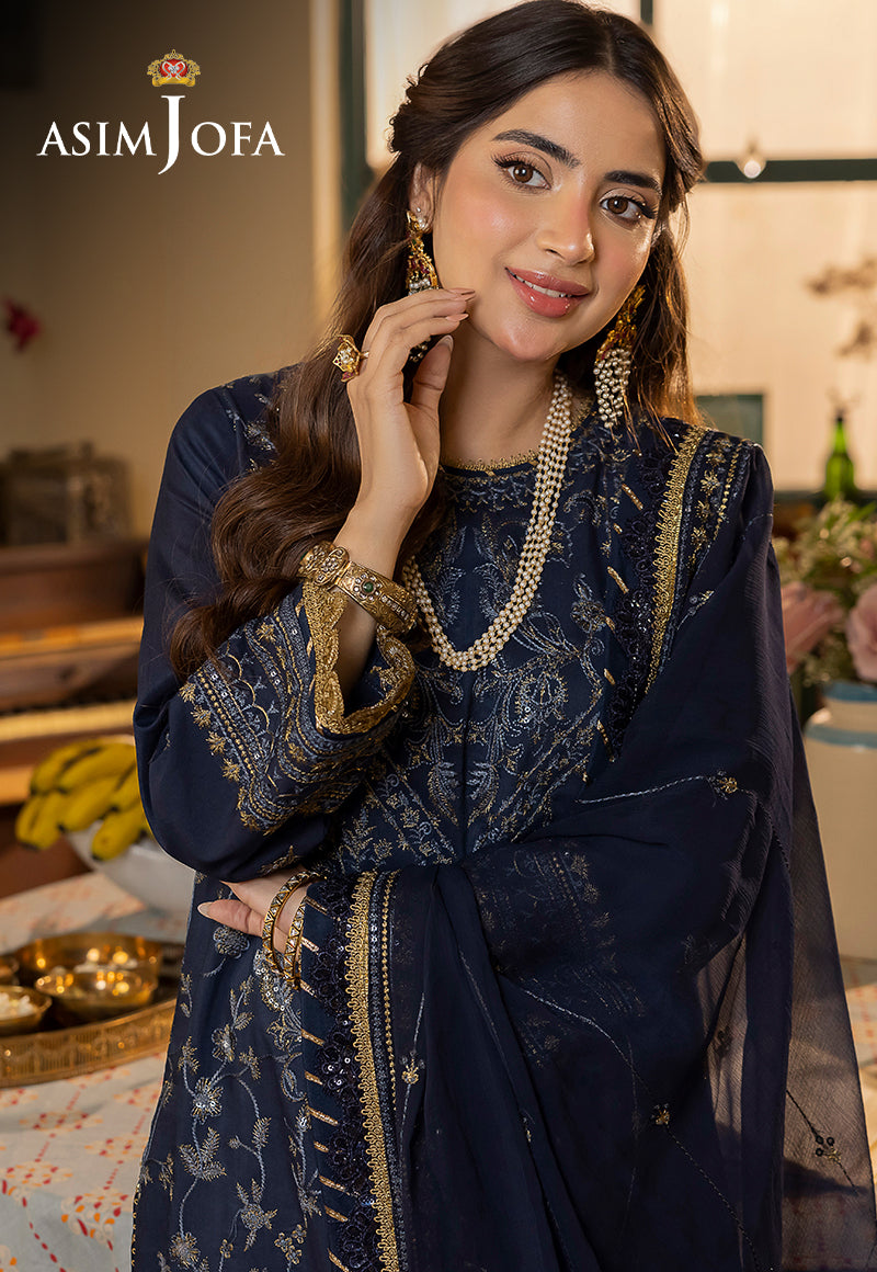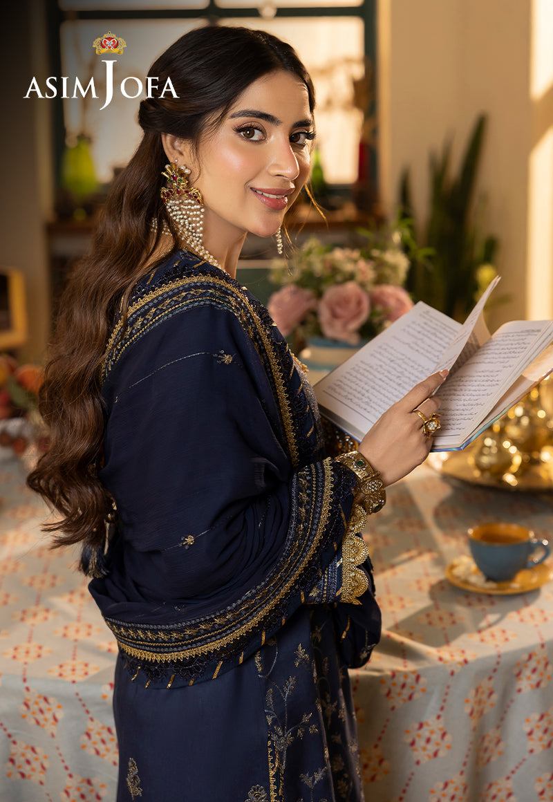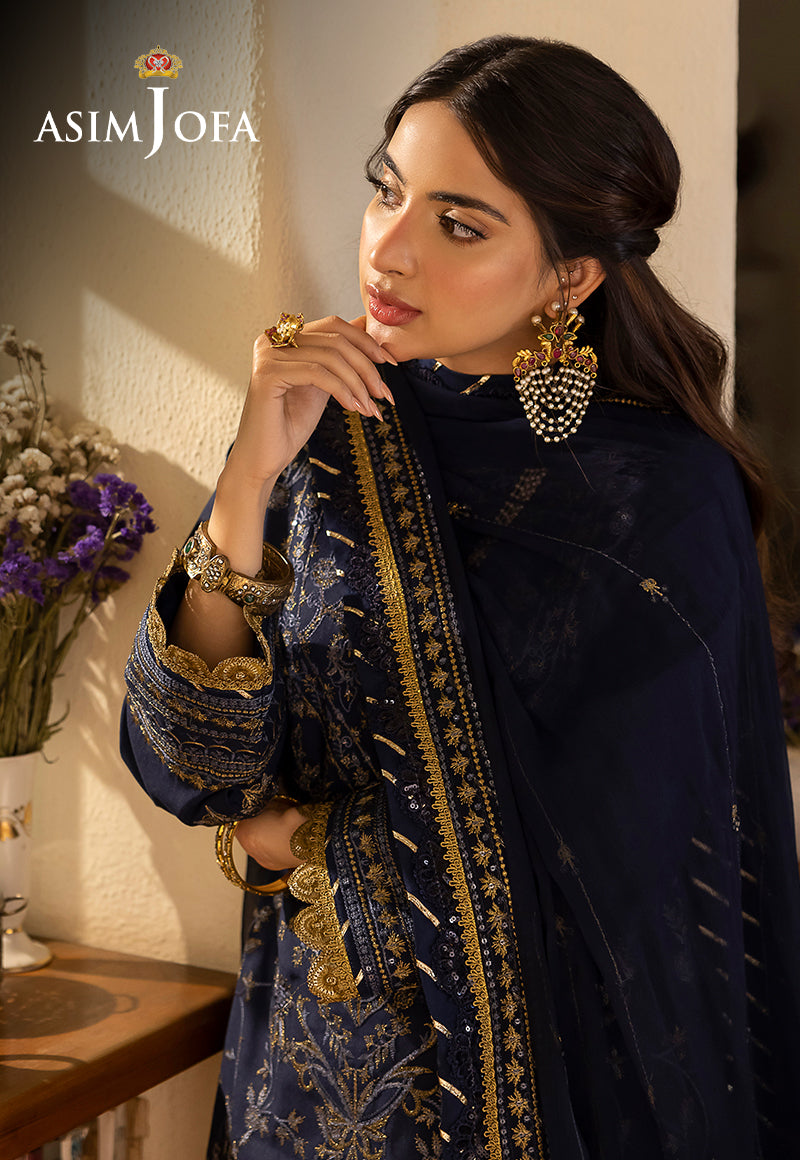 Reimagine ethnic chic with ensembles that blend old-world charm and modern allure. In the enchanting world of "Shadow Work," Asim Jofa unveils the Navy Blue ensemble, a midnight sonata of embroidery that dances beneath the moon's gentle glow. Picture threads of luminous embroidery, akin to the rarest cornflower blue and the purest gold, intertwining like musical notes on a stave. Calico-floral motifs emerge, a chorus of patterns that serenade the senses. At the heart of this symphony lies a neckline, a masterpiece that resonates with the precision of a maestro's baton. The borders of the dupatta become a celestial crescendo, as threads and sequins harmonize in a celestial ballet. Explore the range and craft a unique fashion identity with Asim Jofa.