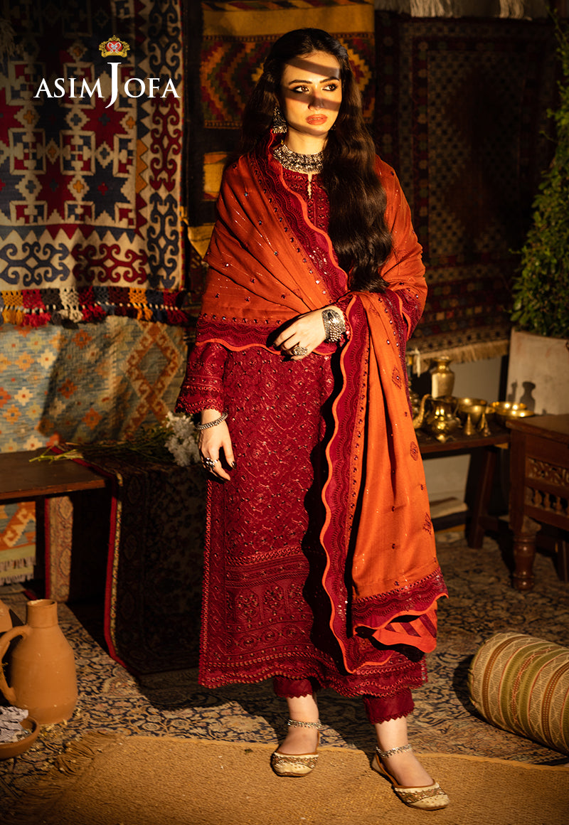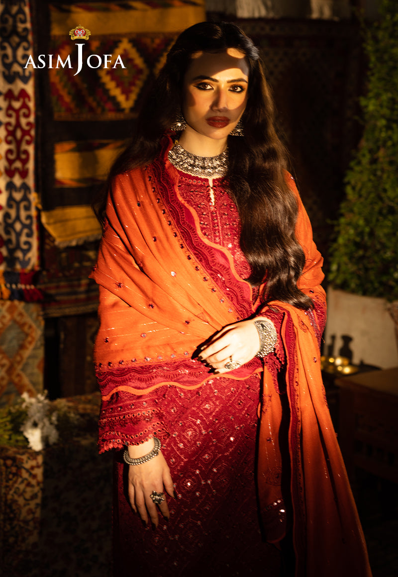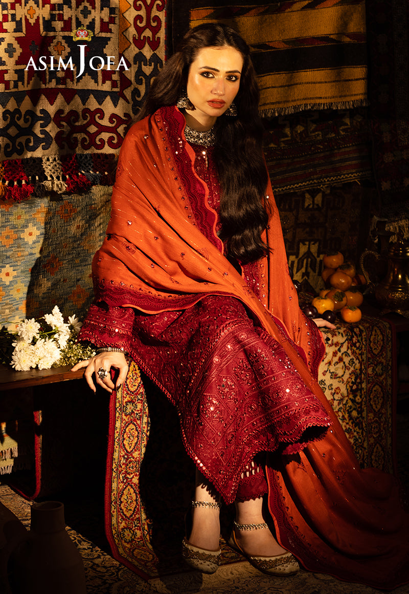 This ensemble is a captivating narrative that seamlessly weaves together the rich heritage of Kashmir with the artistic finesse of the “KASHMIRI TAANKA - Embroidered Shawl Collection.” Adorned with 9mm sequins and thread that replicate the allure of mirror work, it represents metaphorical elegance, much like the whispered tales of Kashmir’s culture. The heavily embroidered shirt, featuring a rhythmic acanthus pattern, echoes the timeless spirit of the region, serving as a testament to tradition and elegance. The shawl reflects the similar design aesthetic as shirt, adorned with 9mm sequins, serving as a metaphorical embrace, inviting you to lose yourself in the enchanting stories of Kashmir. The front and back create a visual tribute to the region’s enduring charm. Sana Javed’s presence adds to its allure, making it a visual ode to Kashmir’s heritage.