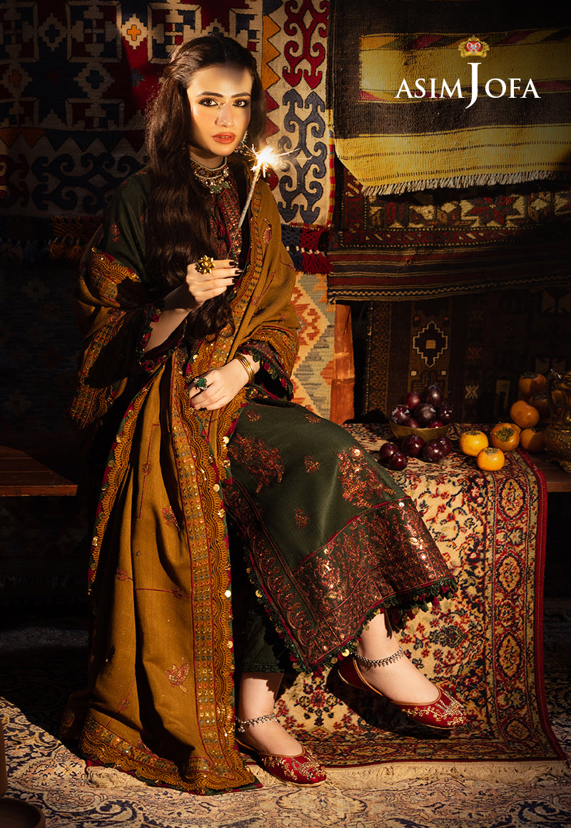 This ensemble is a reflection of timeless artistry, much like the ageless traditions of Kashmir. The shades of dark green and mustard gold, adorned with deep maroonish red, deep gold, and rust threadwork, illuminated by matte gold sequins embroidery, tell a regal tale. The embroidered front neckline and back neckline set the stage for an enchanting narrative. The embroidered border for chaak is a testament to the enduring spirit of Kashmir’s heritage. The shawl, an embodiment of regality, serves as the final chapter in this captivating story.