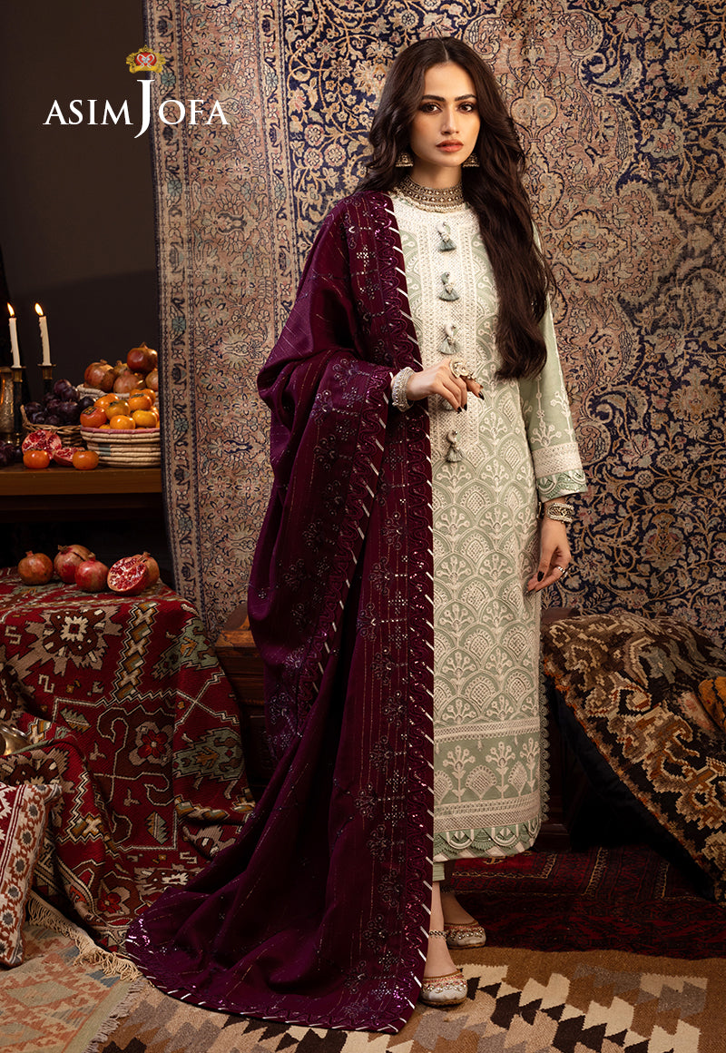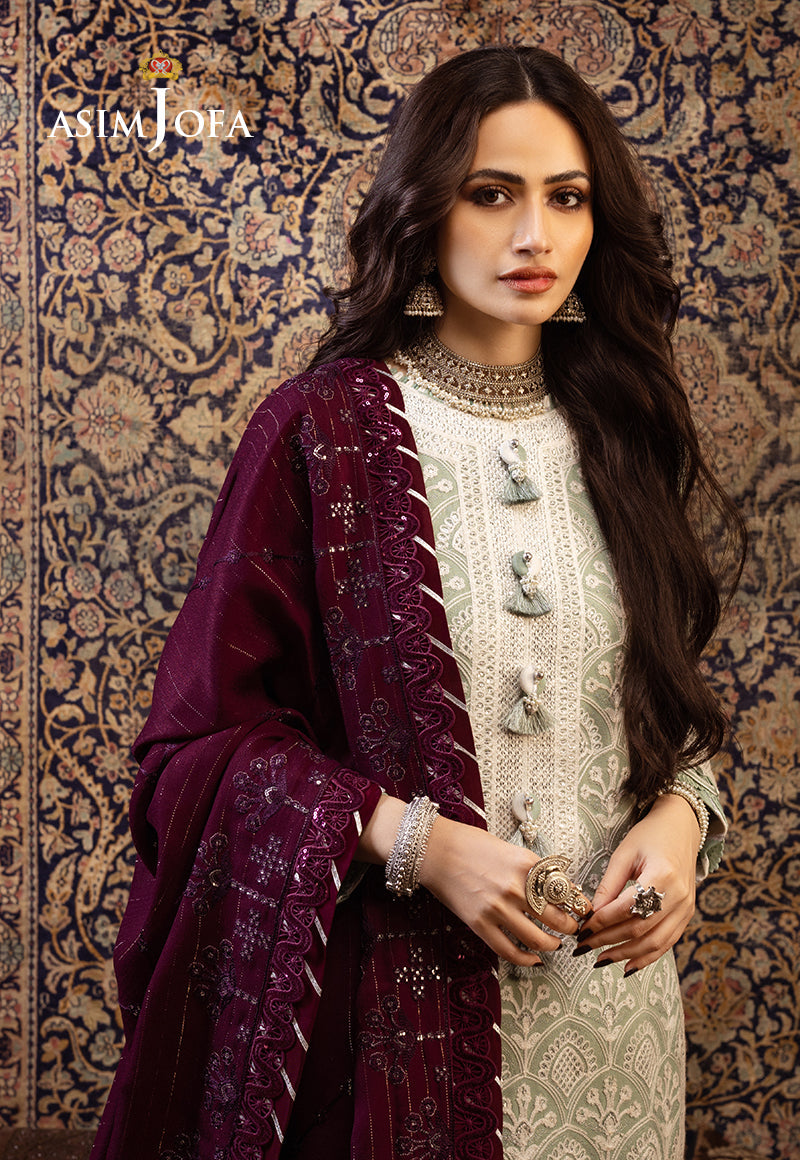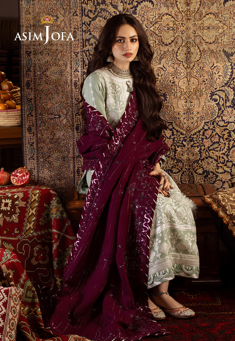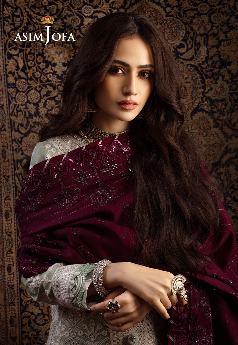 Draped in the splendor of Kashmiri Taanka, this mint green ensemble with a magenta shawl is a stunning piece that embodies the essence of the collection. The Aari Taanka stitch, an age-old tradition, finds new life with off-white thread, cupped silver sequins, and silver zari, paying homage to the region’s rich culture. The arabesque pattern adorns the neckline and mirrors itself on the zari lined self-twill shawl, where contrasting embroidery and sequins create a visual masterpiece. With embroidered front and back on twill, the outfit is a canvas that tells the tale of Kashmir’s charm. Sana Javed’s graceful presence in this outfit further accentuates the timeless grace of Kashmir and the collection’s artistry