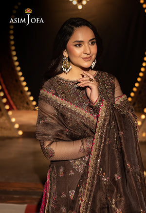 Rich and resplendent, this dark brown ensemble is a tapestry of earthy elegance and artistic finesse. The shirt is exquisitely embroidered with two-toned antique gold zari and shimmering light gold sequins, casting a warm, radiant glow. Threadwork in sage green, purple, rust, and deep beige hues flows across the fabric like a painter’s palette brushed with nature’s finest tones. The ensemble is thoughtfully paired with a floral-printed trouser in a contrasting hue, completed with an embroidered hem that adds a playful yet polished finish. A gorgeously embroidered dupatta ties the look together, echoing the ensemble’s intricate charm and creating a harmonious blend of allure and grace.