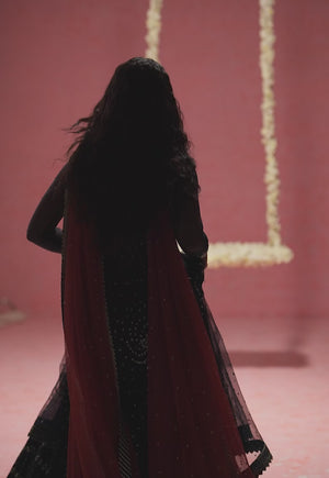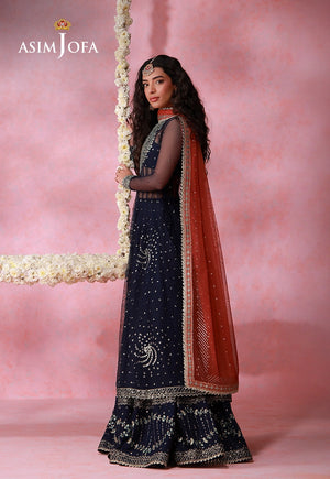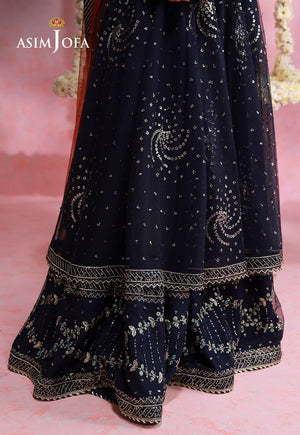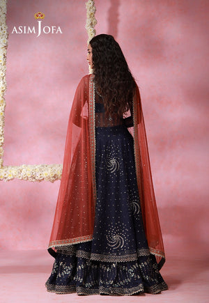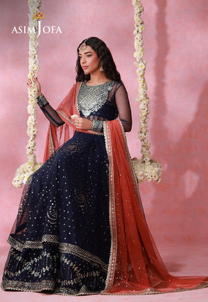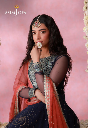 Navigate the evening in a silhouette inspired by the rhythmic beauty of the cosmos, presented in a majestic navy blue kalidaar that echoes the allure of midnight constellations. Lavishly adorned with light gold zari and shimmering sequins, the ensemble is elevated by mint and dark peach threadwork that creates a striking yet sophisticated contrast against the deep blue base. The voluminous lehenga adds grandeur and movement to the silhouette, while a contrasting deep peach embroidered dupatta completes the look with a luminous flourish of color and elegance.