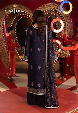 A portrait of refined simplicity, this navy blue ensemble captures the essence of serene sophistication. The shirt is adorned with delicately placed embroidered motifs that whisper elegance, gradually unfolding into a garden-inspired border rich with detail. Shades of magenta and navy thread intertwine with light gold sequins and zari, creating a tapestry that feels both grounded and graceful. The look is completed with a lavishly embroidered dupatta, blooming with all-over foliage patterns that add texture and visual intrigue. A seamless blend of subtlety and opulence.