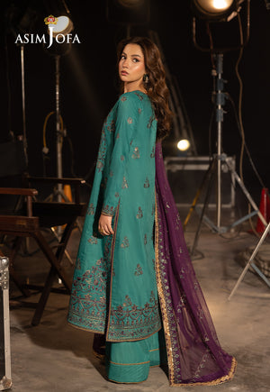 Drenched in an elegant shade of green, this ensemble is a graceful blend of tradition and artistry. The shirt serves as a canvas of beauty, intricately adorned with antique gold zari and sequins that catch the light with every movement. Sea green and purple threadwork weave through the embroidery, adding depth and a touch of whimsical charm. A contrasting purple dupatta, lightly embroidered, completes the look—creating a harmonious balance of design and texture. This ensemble is a refined celebration of color, perfect for making a subtle yet unforgettable statement.