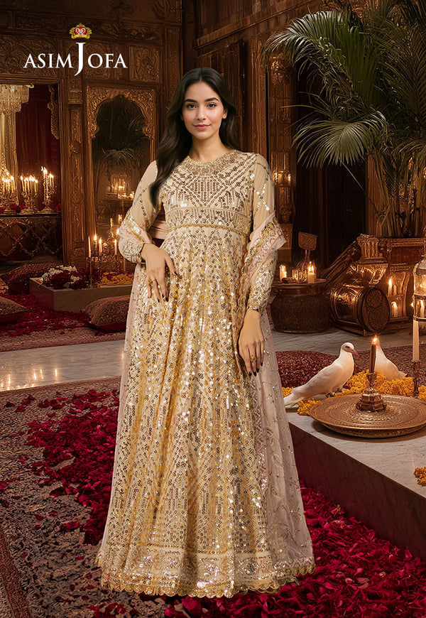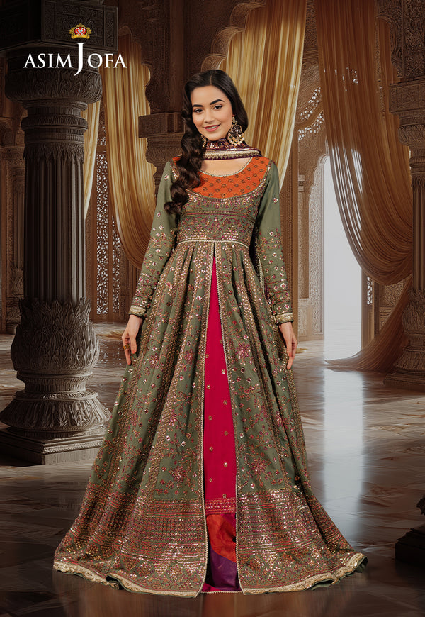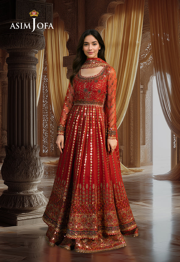 Exude the essence of festive glamour with Asim Jofa’s “Jag Mag Collection.†Presenting our rust ensemble. This ensemble features a long shirt meticulously embroidered with golden sequins and dual-toned...
