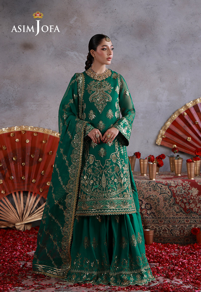 A rich, heritage-inspired vision that balances the weight of tradition with a sharp, modern clarity. Bathed in a deep teal hue, this ensemble is adorned with gold zari and shimmering sequins, illuminated by accents of aqua green threadwork. The heavily embroidered trousers and dupatta enhance the regal appeal, creating a cohesive look that feels both timeless and contemporary. Designed for the woman who carries elegance with quiet confidence, this ensemble makes a powerful statement of refined luxury.