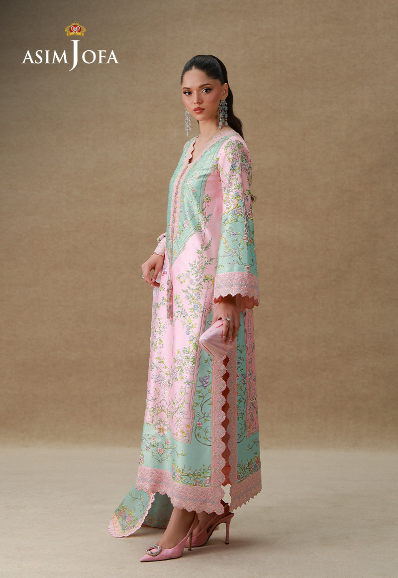 Soft as a sigh and serene as dawn, this pastel pink ensemble is a dream delicately woven in silk. The charmeuse canvas is adorned with an ethereal print that mirrors spring skies brushed gently across a painter’s palette. Fine thread embroidery and shimmering sequins highlight the neckline, sleeves, and borders, glistening like morning dew upon petals. Paired with a digitally printed silk dupatta that flows like a soft breeze through blossoming orchards, this ensemble captures quiet luxury—crafted for those who enchant with effortless grace.