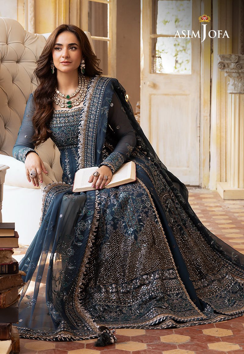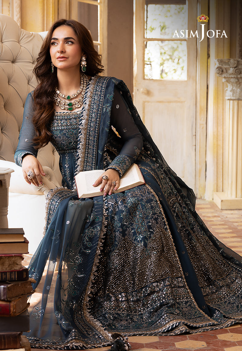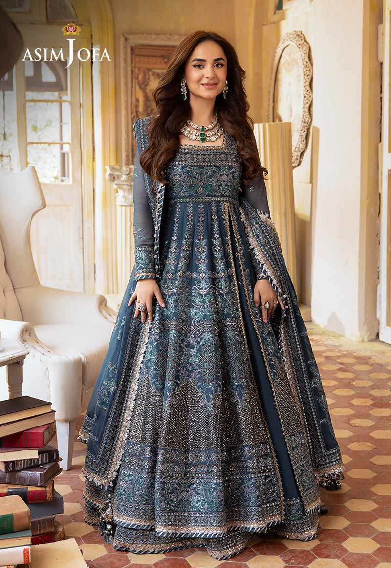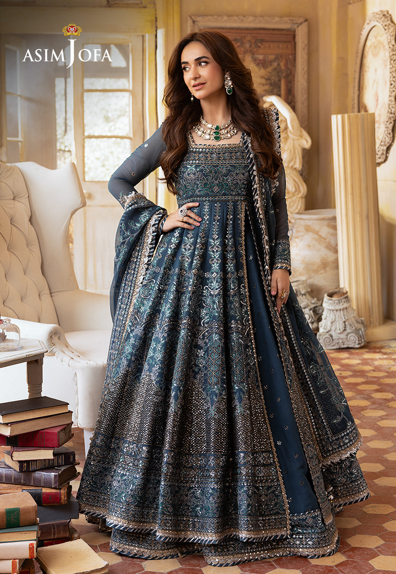 Wrap yourself in the Sapphire Dreamweave Ensemble—a cadet blue peshwas and lehenga adorned with silver 5mm sequins and dual-tone zari, intertwined with black thread, creating a dreamweave of elegance. The intricate embroidery, featuring acanthus and floral motifs, paints a vivid picture on the canvas of the peshwas, mirroring the enchanting dupatta. The embroidered bodice, kalis, and hemline form a tapestry of sophistication enveloping you in the essence of a sapphire dream—a timeless masterpiece that transcends the boundaries of fashion.