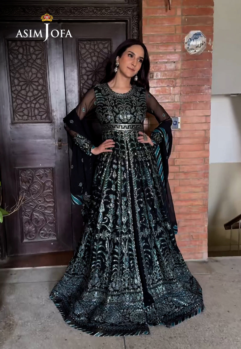 Dance through the celestial garden of dreams with this Celestial Noir Waltz from Asim Jofa's “Khwab-E-Naubahar” collection. This black peshwas and lehenga has two-toned gold and silver zari, twirling with silver cupped sequins and teal threadwork, paints a mesmerizing scene. The bodice, sleeves, and dupatta borders are embroidered with the language of dreams, while the peshwas and lehenga gracefully waltz with embroidered kalis and hemlines. Wrapped in the chiffon dupatta adorned with embroidered borders, you become the main character of a nocturnal fairytale.