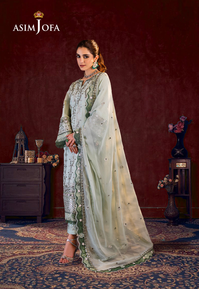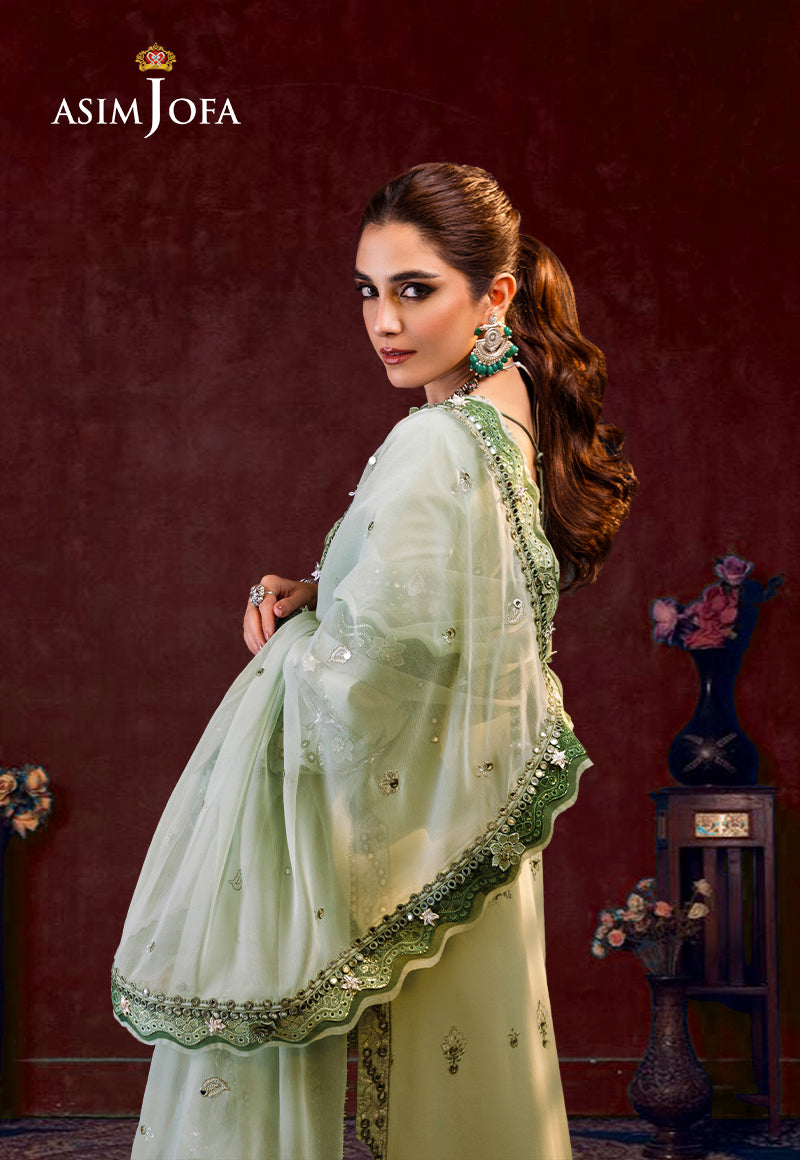 Embrace the jade aura of tranquility with this enchanting ensemble adorned with shimmering 9mm silver sequins and zari work along with delicate light mint, dark sage threadwork. Like an aura of calm, the embroidered panels and back exude elegance and grace. The embroidered borders add depth and richness to the ensemble while the embroidered sleeves and hem border radiate serenity. Wrap yourself in the embroidered dupatta and let the misty jade aura envelop you in its tranquil embrace