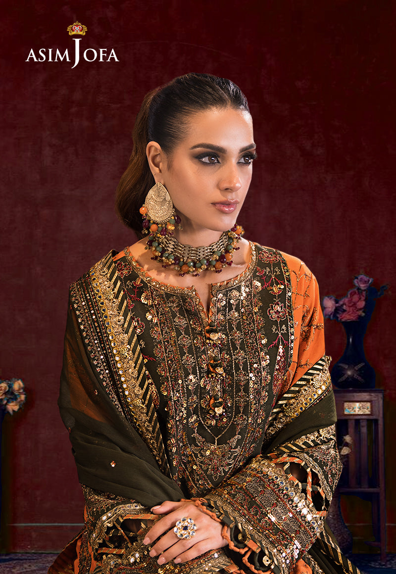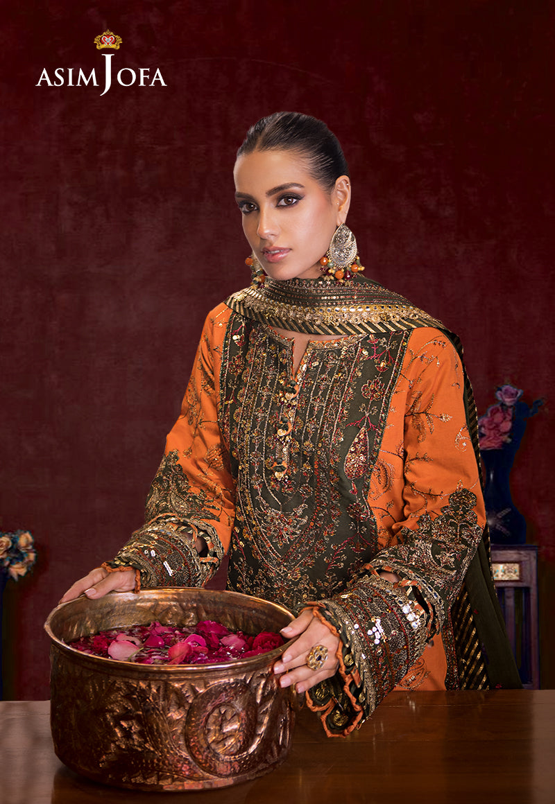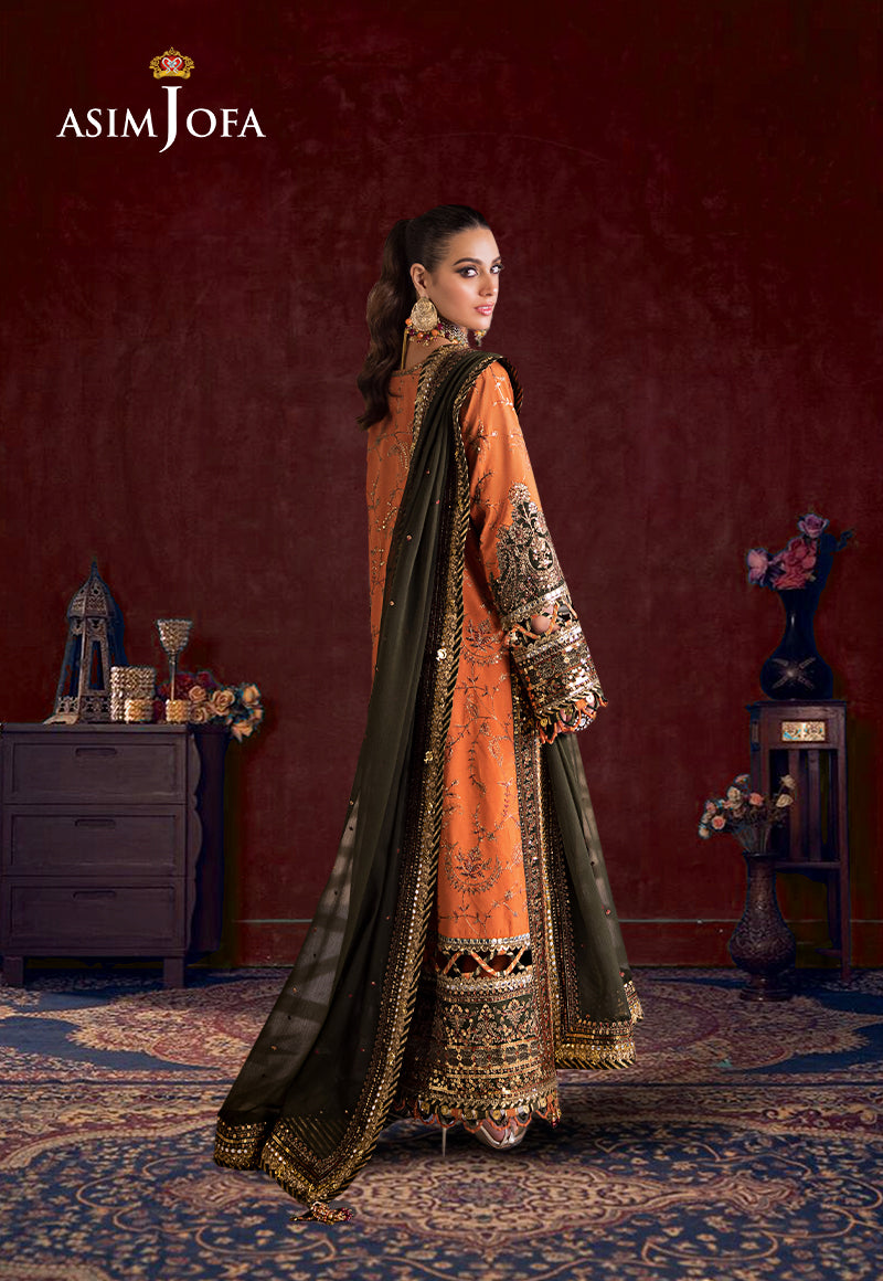 Immerse yourself in the symphony of a harvest sunset with this enchanting orange ensemble featuring olive green accents reminiscent of the changing hues of twilight. The rust and coral-colored threadwork alongside vibrant orange tones, dance like rays of sunlight upon ripe fields while intricate aari stitch and gold zari work shimmer like golden grains in the sunset glow. The embroidered neckline and jaal for the front evoke the serenity of twilight skies while embroidered borders and motifs add depth and elegance to the ensemble. Complete your look with the embroidered border for chaak and the dupatta featuring a four-sided border embracing the harmony of nature's bounty and celebrating the joy of harvest. Step into the enchanting twilight with this symphony of colors and energies, perfect for festive celebrations and cherished moments of togetherness