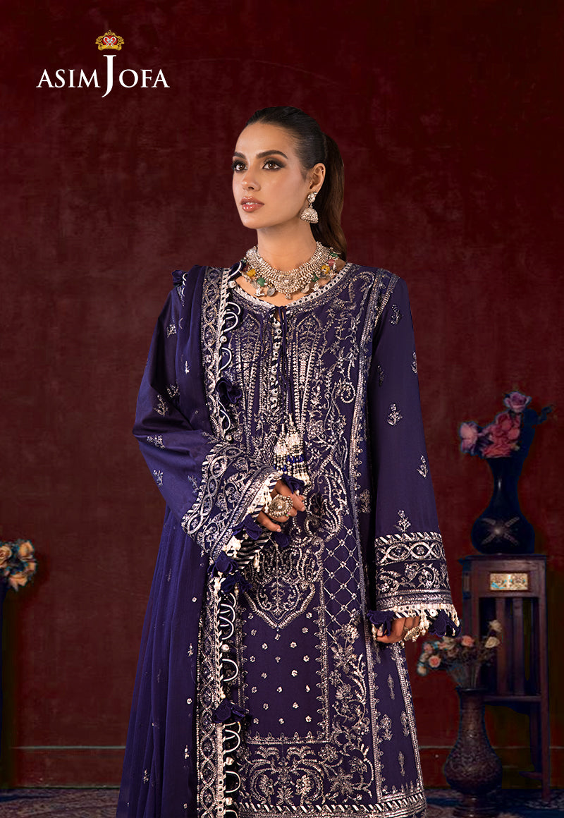 Embrace with this indigo blue ensemble adorned with luminous embroidery where delicate 3mm cupped silver sequins and intricate self-color thread with two tones zari work weave a tapestry of celestial beauty. The embroidered center panel and side panels resonate with the harmony of the cosmos while the embroidered border for daman reflects the splendor of charm. Embroidered sleeves with borders echo the gentle whispers of melodies and the embroidered border for chaak invites you into the celestial dance.