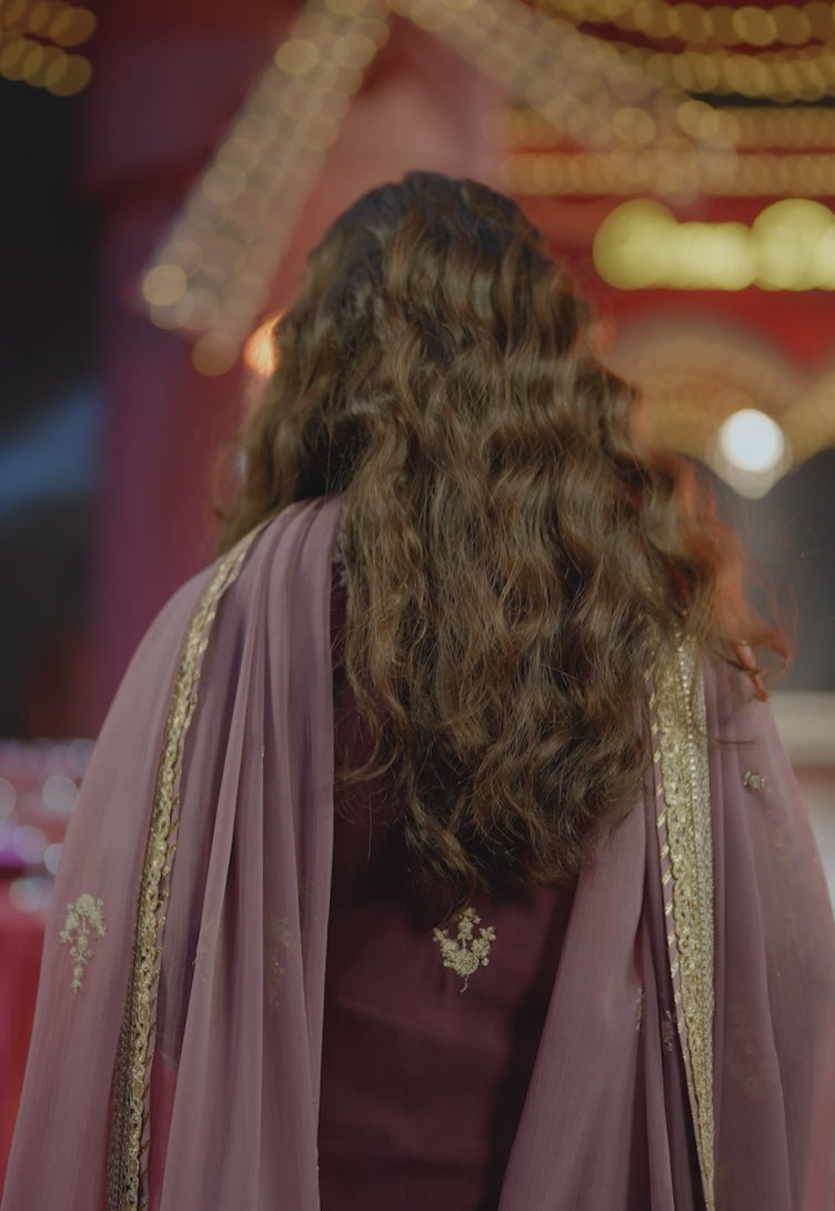 As if drawn from an ethereal garden, this plum ensemble enchants with its beauty. The shirt is adorned with an intricate web of gold zari and sequins, forming a foliage-inspired design that winds across the fabric. Every thread whispers a story of grace. Adding contrast and charm, the dupatta features scattered embroidered motifs that flutter like fallen petals—bringing movement, texture, and a breath of fresh elegance to this stunning creation.