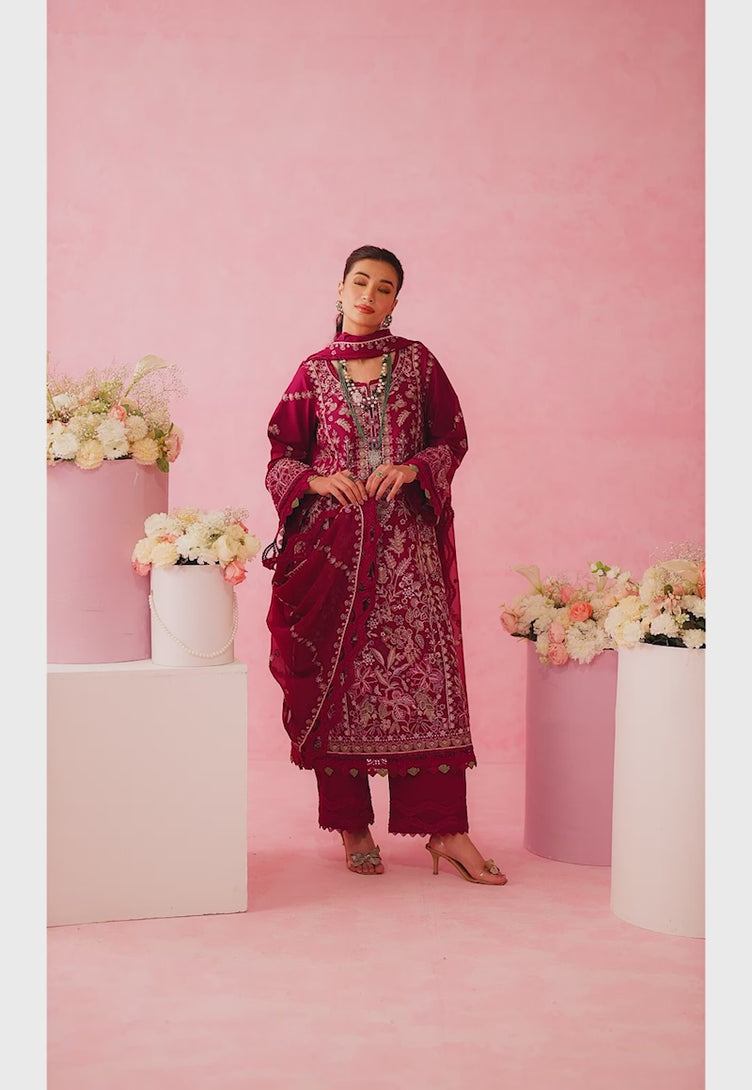 Steeping the senses in a vibrant viticulture of style, this magenta ensemble is a striking celebration of floral and botanical artistry. The richly embroidered shirt comes alive with lush green and beige threadwork, evoking the freshness and vitality of a sun-drenched summer garden. Crafted using a refined appliqué technique for the floral motifs, the design creates a beautiful interplay of form and shadow, lending a subtle three-dimensional depth that elevates the natural serenity of the lawn base. Completing the look is a delicately embroidered chiffon dupatta, floating effortlessly with a soft translucence that balances the bold intensity of the magenta canvas.