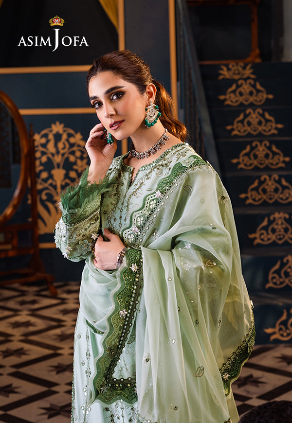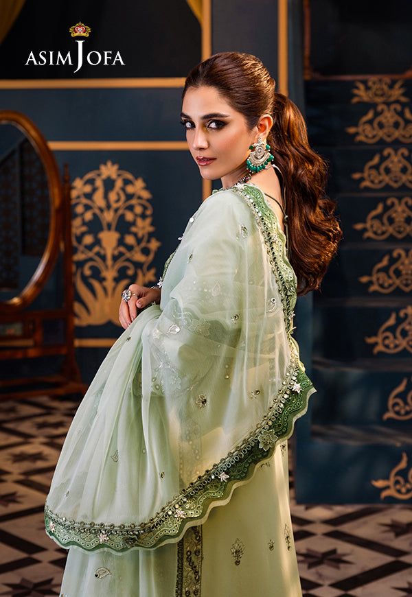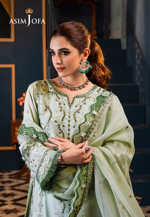 Embrace the jade aura of tranquility with this enchanting ensemble adorned with shimmering 9mm silver sequins and zari work along with delicate light mint, dark sage threadwork. Like an aura of calm, the embroidered panels and back exude elegance and grace. The embroidered borders add depth and richness to the ensemble while the embroidered sleeves and hem border radiate serenity. Wrap yourself in the embroidered dupatta and let the misty jade aura envelop you in its tranquil embrace.