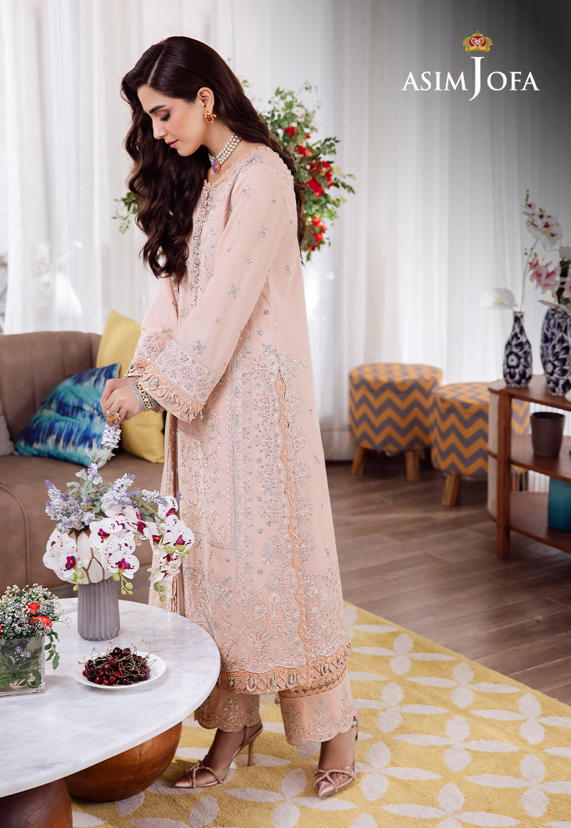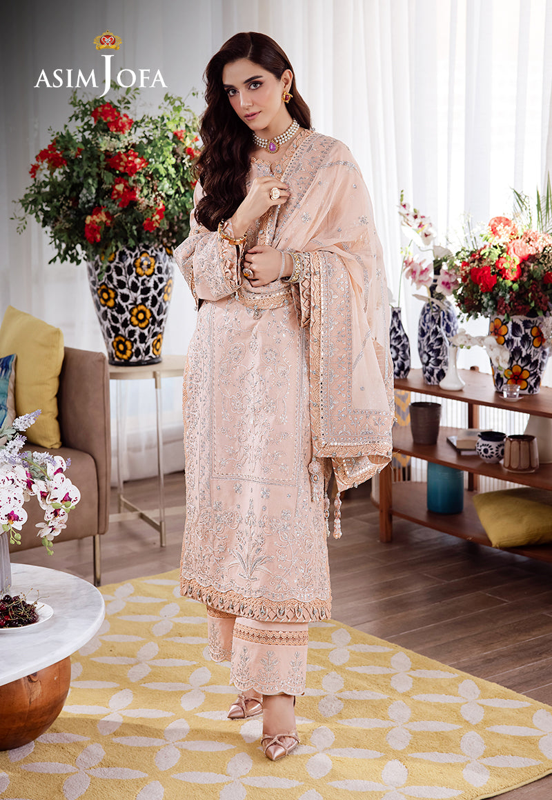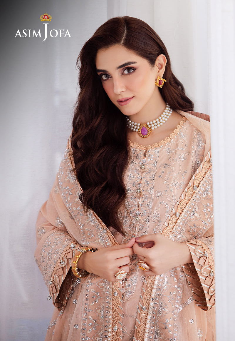 Step into the empowerment of your own strength with this dress, a symbol of magnificence. The soothing pale peach color is like a soft declaration of acceptance. The pastel shirt features light pink Dori work with hints of twister silver, adorned by glittery argent sequins beautifying the lines of silver Zari work. The embroidered chiffon dupatta’s delicate draping is like the wings of a songbird, singing its journey of self-discovery. Embroidered with perfection, the trouser enhances the overall look of the ensemble. Announce to the world that you are unstoppable.