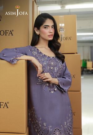 Evoking the charm of classic heritage, this dark lilac ensemble is a celebration of traditional artistry. The shirt showcases a graceful floral design brought to life through the intricate boring technique, creating delicate cutwork that adds depth and dimension to the fabric. Multihued threadwork in harmonious lilac tones enriches the composition with subtle texture and movement. Paired with embroidered trousers, the ensemble offers a refined look that blends timeless craft with graceful elegance.