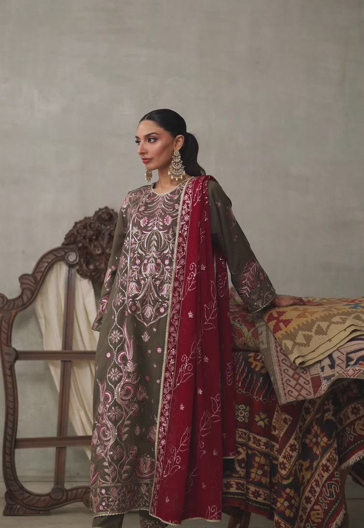 Exuding quiet luxury, this dirty green ensemble is a vision of textured elegance. Intricate threadwork breathes life into the serene canvas, while floral elements unfold across the shirt with poetic charm. Trousers finished with an embroidered border add structure, while the contrasting red dupatta, richly embroidered, introduces a bold flourish—making this ensemble a perfect choice for refined soirées.