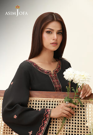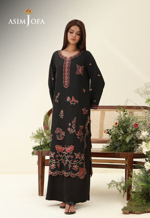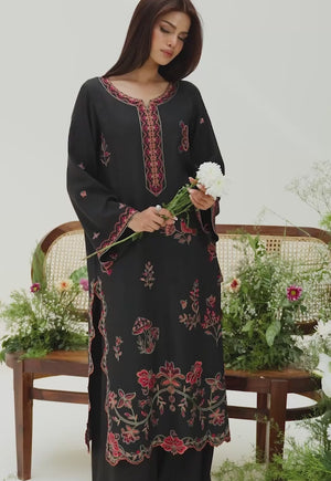 Like florals blooming beneath a twilight sky, this black ensemble captures the mystique of a nighttime garden. Vivid embroidery in nature-inspired hues unfurls across the dark base, where intricate blossoms and organic motifs come alive in striking contrast. Scalloped edges trace the borders with a soft decorative finish, adding dimension to the silhouette. Styled with relaxed trousers, this piece transforms everyday dressing into something artful and evocative.