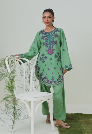 Rooted in heritage yet styled for today, this green ensemble celebrates cultural artistry through striking motifs that grace the front with presence and poise. The design feels expressive yet balanced, offering visual impact without excess. Scalloped detailing along the hem adds a refined contour, framing the silhouette with subtle ornamentation. Paired with plain trousers, it delivers a look that honors tradition with contemporary ease.