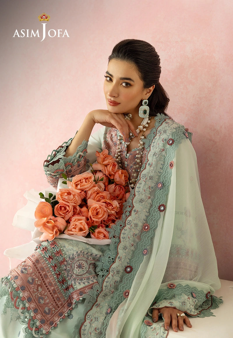 Breathable and bright, this light mint green ensemble is an embroidered masterpiece that captures the essence of a spring morning. The fabric features all-over boring technique, layered with threadwork in a multifaceted palette of dark mint, beige, cornflower blue, and deep tea pink. The daman stands out with paisley motifs in side-bunches, expertly appliqued and framed by a gorgeous pink border on satin silk. Embroidered trousers echo the rhythm of luxury, while a beautifully embroidered chiffon dupatta completes the ensemble with effortless grace.