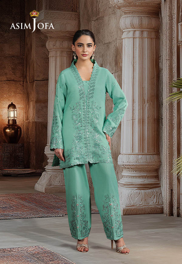 She evokes old Hollywood charm dressed in this stylish long shirt. An unusual combination of mint green and ochre with a dazzle of mirrors and scrollwork of golden zari done...