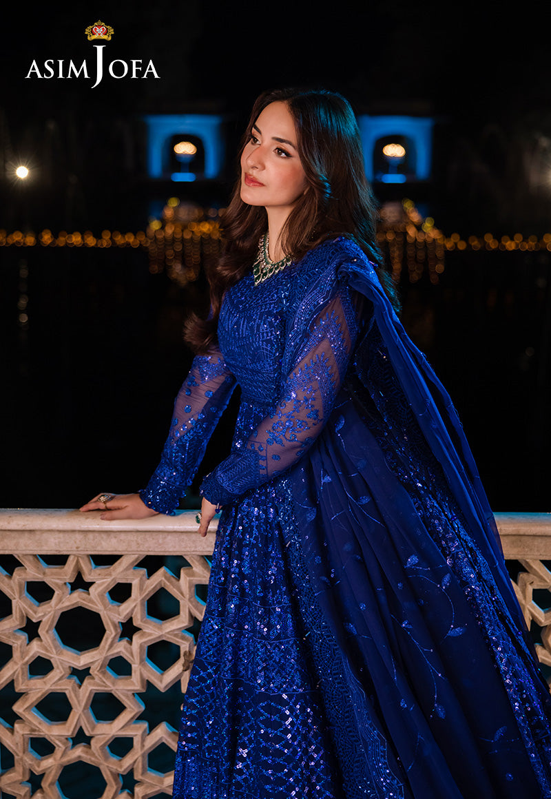 Wrapped in the tranquility of a pre-storm sky, this ensemble shimmers like lightning about to strike. The embroidered Peshwas, a masterpiece woven from gossamer dreams, is adorned with holographic sequins, each a tiny star caught in the web of midnight blue threads. Like a queen veiled in mist, the embroidered dupatta crowns this ethereal look, making it a mesmerizing addition to your occasionwear wardrobe.