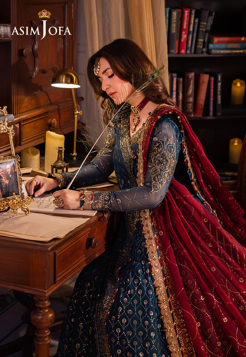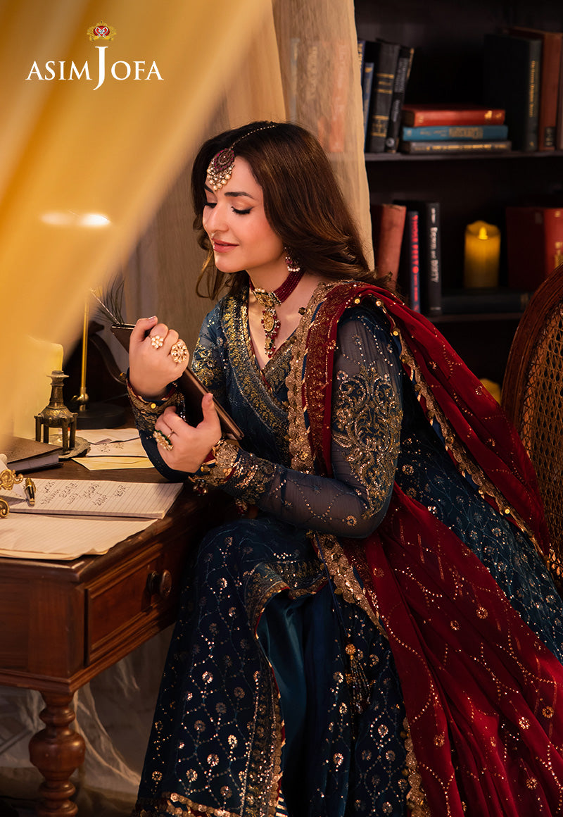 Swathed in the opulence of regality, this teal-hued outfit exudes an aura of understated elegance. The intricately embroidered Angrakha, a treasure chest of design, is adorned with dual-toned antique gold zari threads that shimmer like moonlight on water, surrounded by color-coordinated sequins that mimic the ocean's gleam. The red embroidered dupatta, a fiery sunset over the sea, completes this bold statement of elegance.
