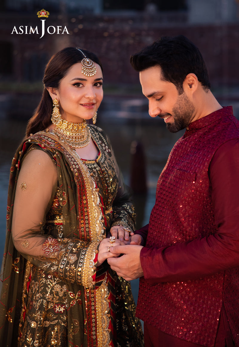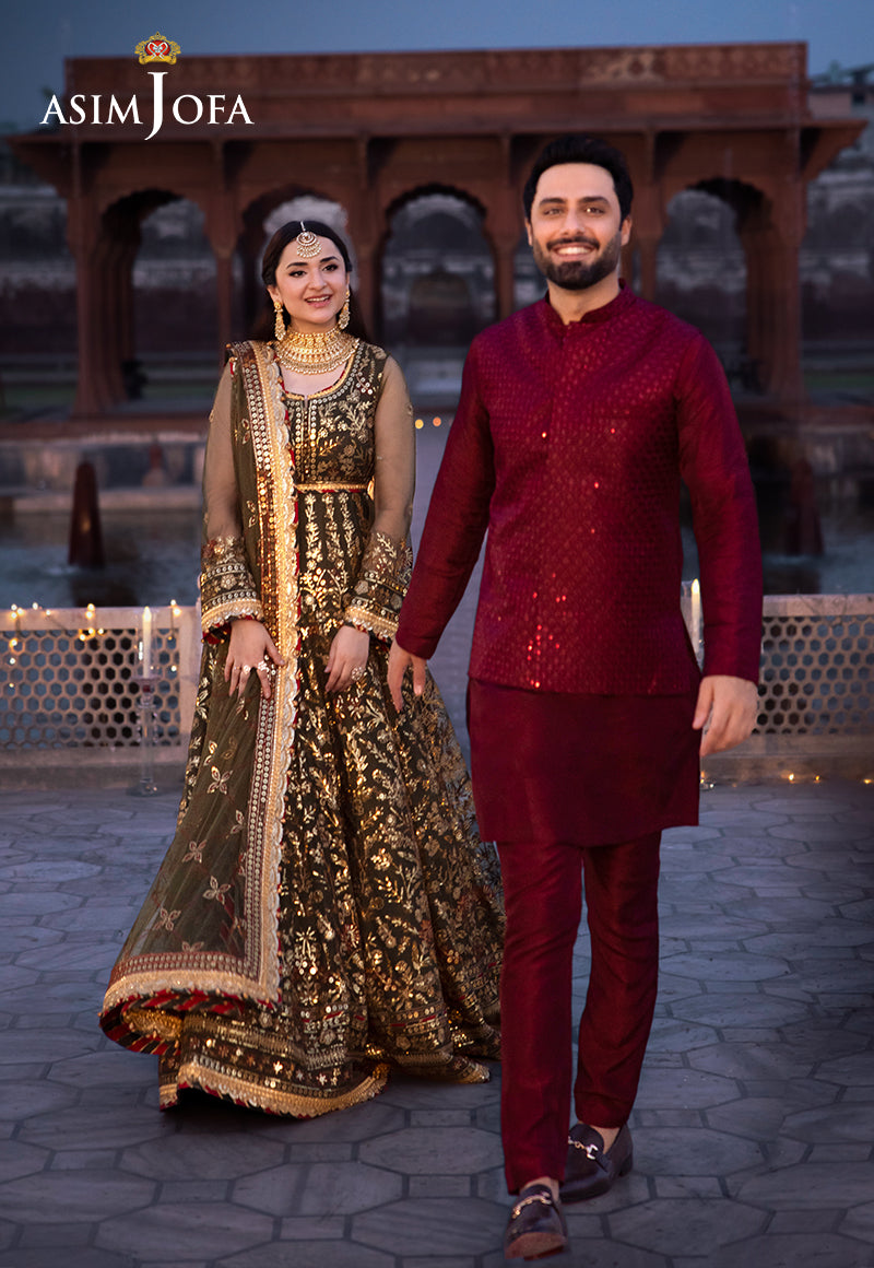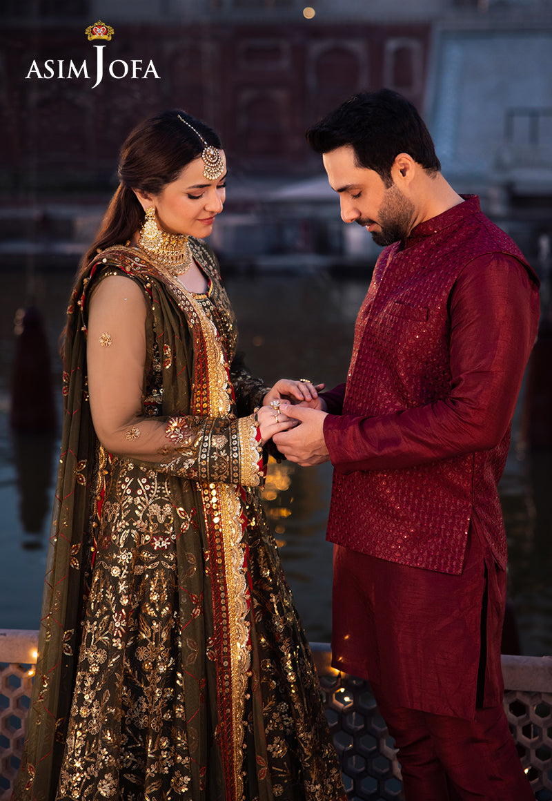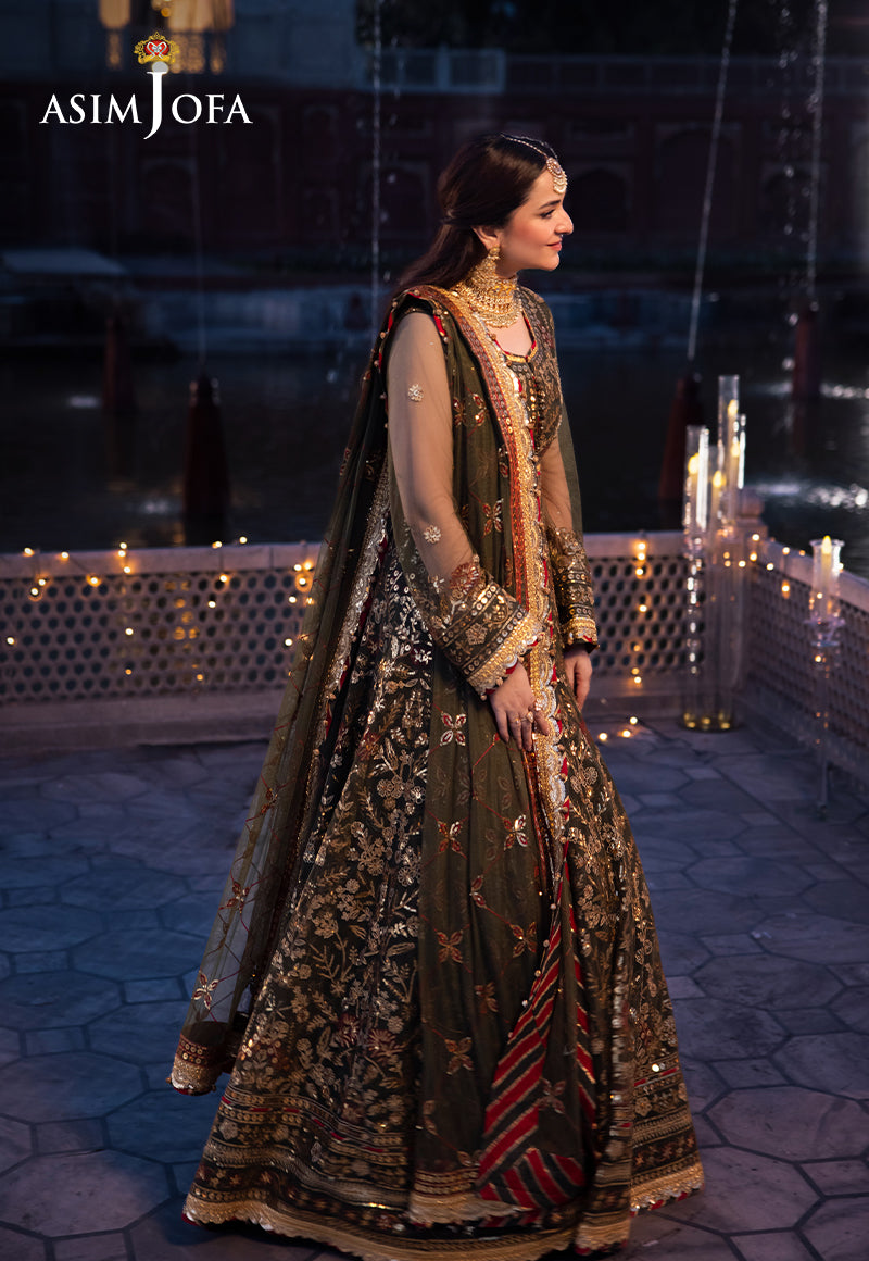 Synonymous with palatial gardens that are alive with blooming florals in vibrant hues, this olive-green ensemble is an epitome of resplendence. The embroidered Peshwas, a glimpse of grace, is beautified with threadwork in the enchanting hues of crimson and beige, intricately detailed with gold zari amidst a cluster of gold sequins, glistening like morning mist on petals. The embroidered dupatta, mirroring the magnificence of the outfit, makes it a timeless ensemble, perfect for dreamy-dusk celebrations.