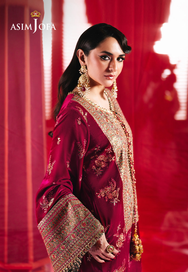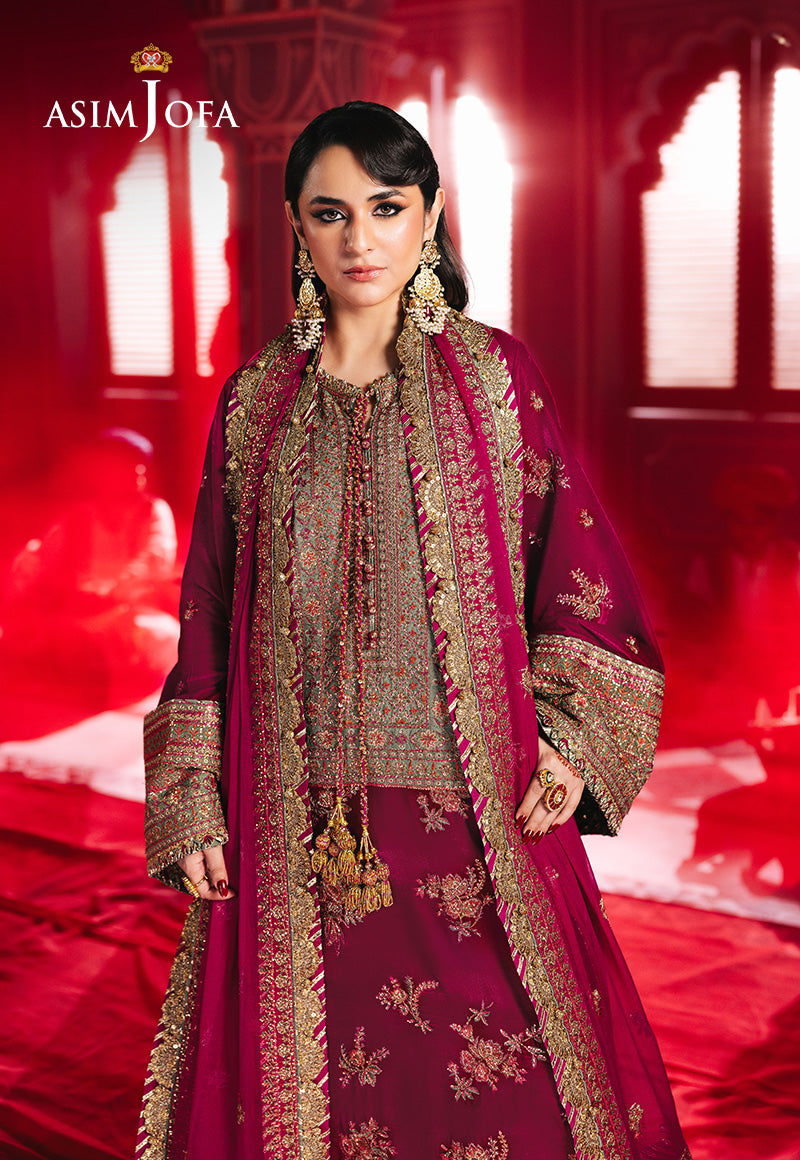 Drenched in the regal allure of magenta, this opulent ensemble is a testament to timeless elegance. The velvet shirt features embroidered neckline, border and sleeves on silk, adorned with a canvas of deep gold zariwork, shimmering with the brilliance of 5mm cupped sequins, while intricate magenta and vibrant rust threadwork intertwine to create a symphony of color and texture. Complemented by an exquisitely embroidered dupatta, this masterpiece exudes an air of grandeur, making it a flawless choice for those who seek to embody grace and sophistication.