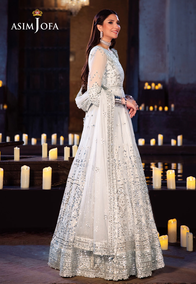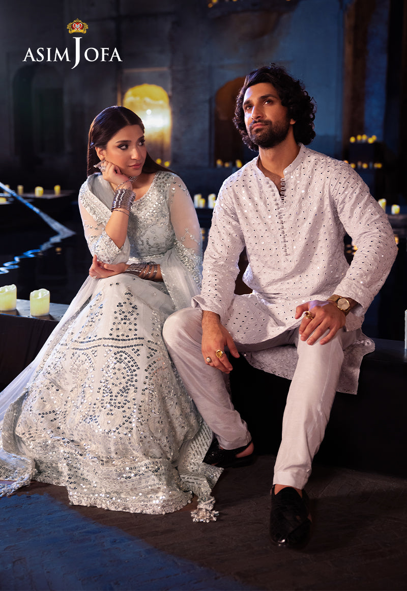 Clad in the ethereal glow of a pale blue sky, this ensemble is a dream woven from moonlight. The stunning Peshwas, a masterpiece of splendid embroidery, is adorned with silver zariwork that dances like starlight, surrounded by silver sequins shimmering like a cluster of stars. The 9mm sequins, like larger stars, illuminate this astral vision. The embroidered dupatta, a flowing cloud of elegance, completes this picture-perfect ensemble.