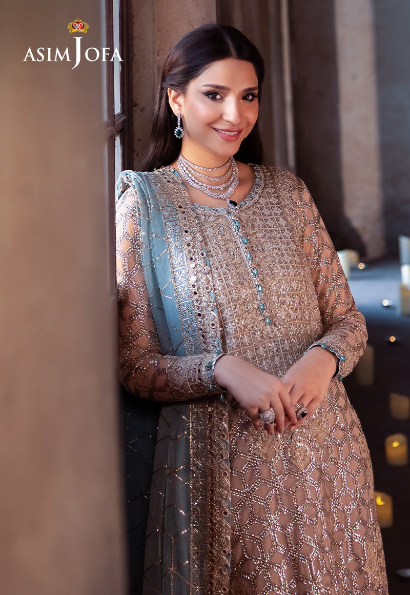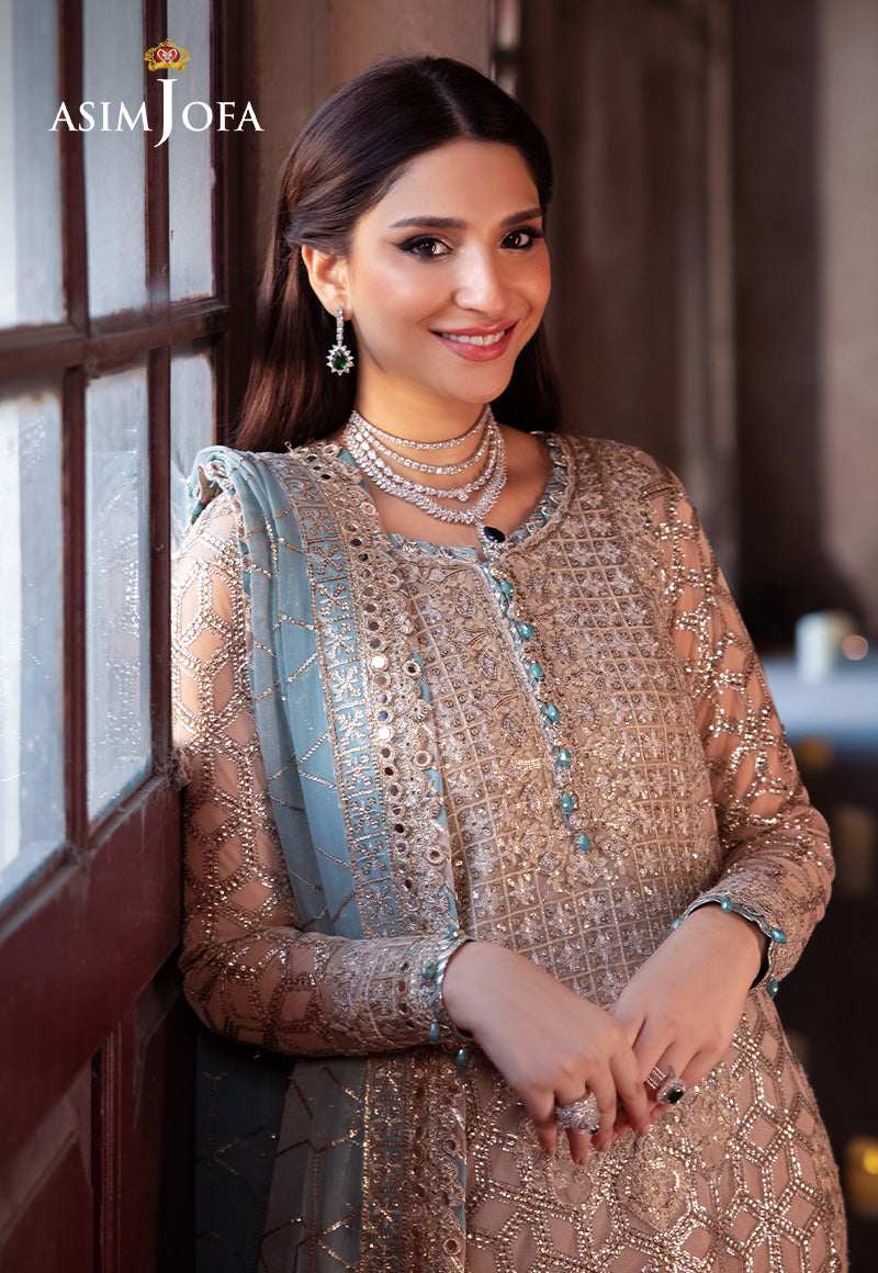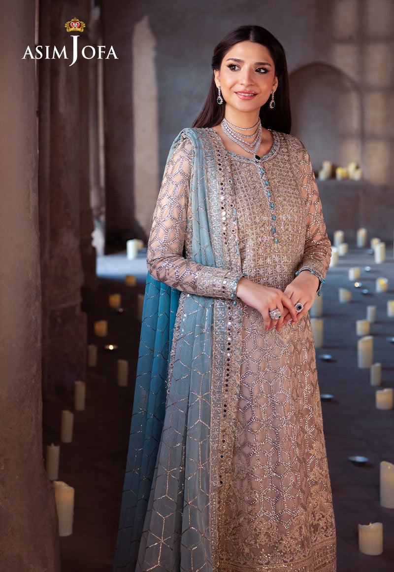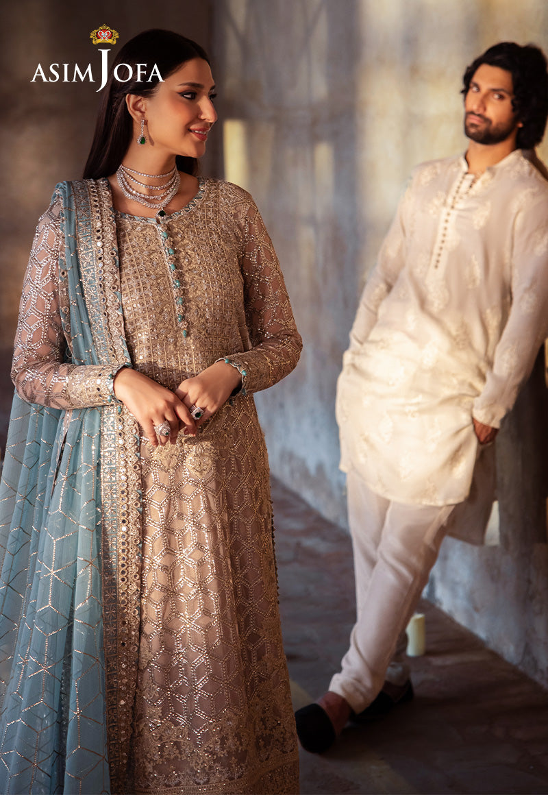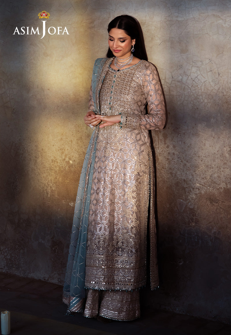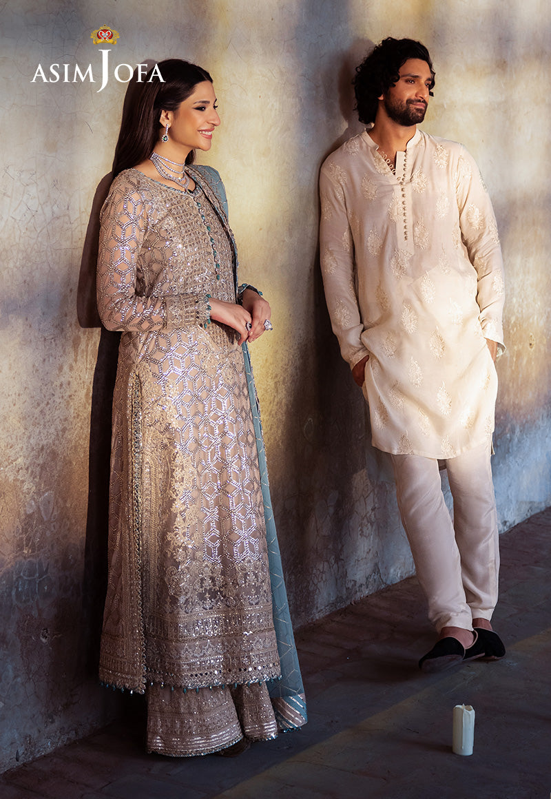 Cloaked in the tranquility of a sandy shore, this ensemble is a masterpiece of understated luxury. The embroidered shirt, a canvas of beige, is adorned with a neckline and border featuring a harmony of silver lurex and anchor threads, shimmering like a chrome ornament in sunlight. The sequins, a constellation of light gold and silver, create a mesmerizing tapestry exuding ganga jamni aura. The trousers, finished with a delicate border, complete the coastal dream. Draped with a dupatta as fresh as sea foam, this ensemble is a serene escape.
