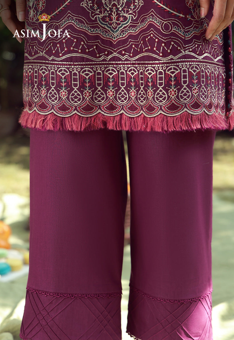 Where celebration meets couture in a symphony of color. This magenta creation is richly embroidered with beige, green, rust, and tonal magenta threads, weaving tradition into a distinctly modern silhouette. The artistry across the shirt captures the essence of Eid’s vibrance, while the gorgeously printed chiffon dupatta adds movement and flair, ensuring every step feels like part of a grand entrance