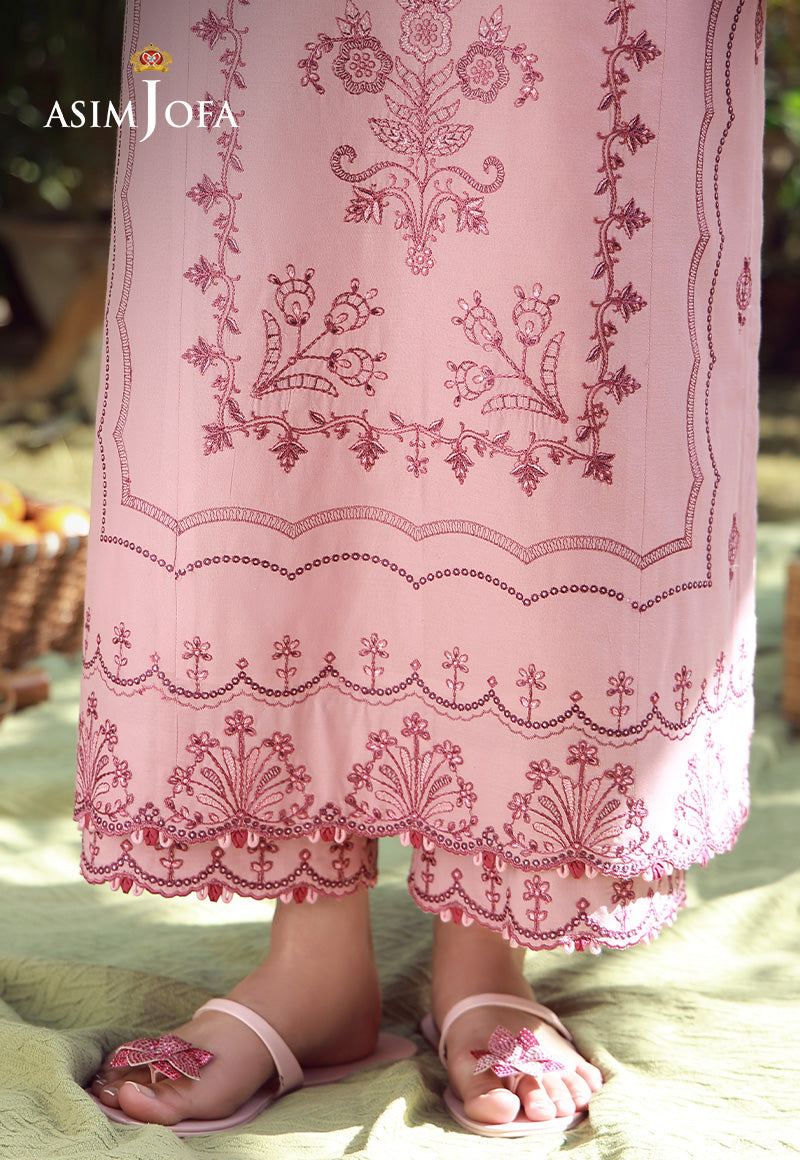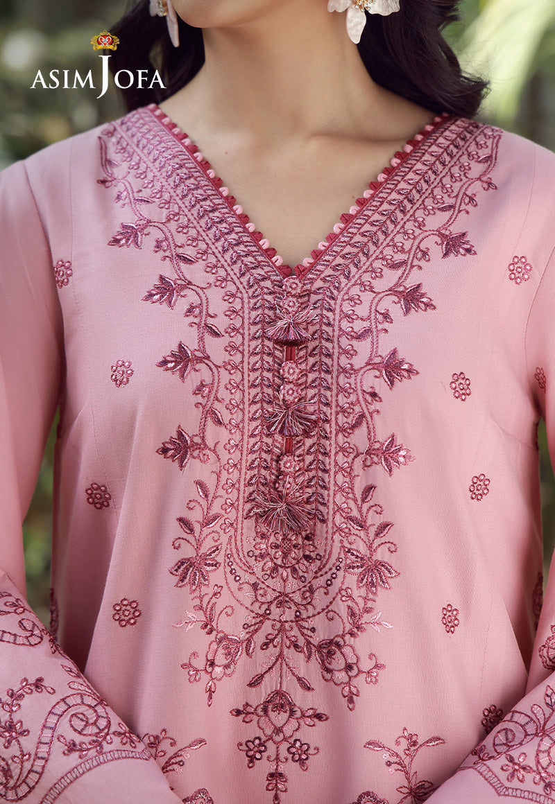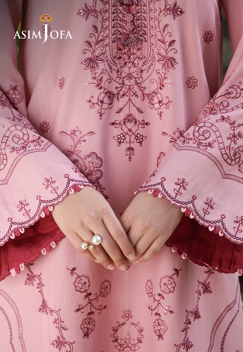 Soft as a festive dawn, radiant as a summer celebration. Rendered in tea pink, the shirt features tonal embroidery in varying pinkish hues, creating depth and texture that subtly glows under the Eid sun. The printed chiffon dupatta flows effortlessly alongside, making this ensemble a graceful choice for warm gatherings and joyful reunions.