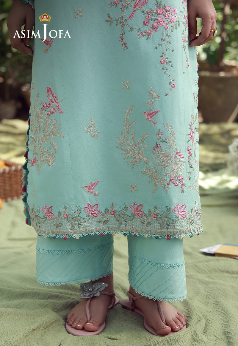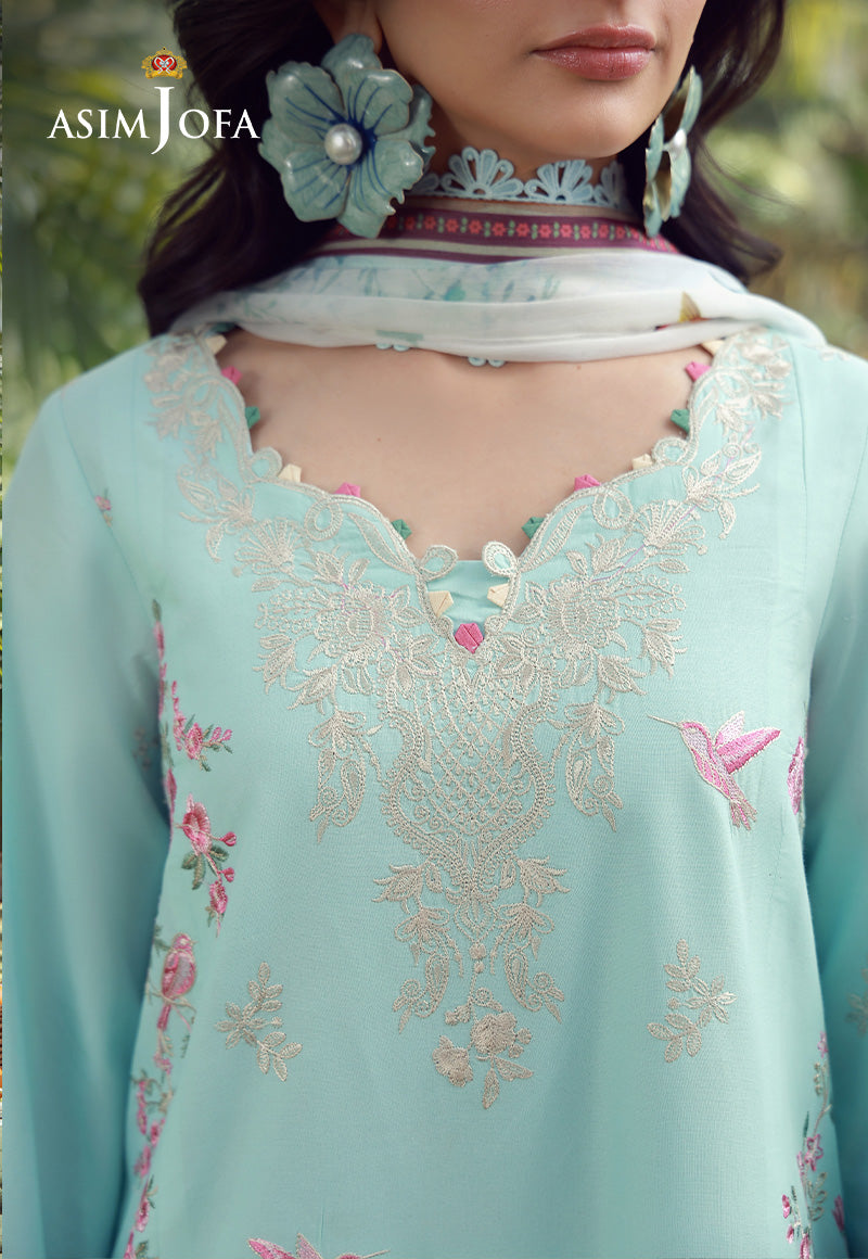 A breath of freshness woven into festive couture. This aqua creation is adorned with contrasting threadwork and natural motifs that scatter across the shirt like a flourishing garden. Light, refreshing, and effortlessly radiant, it is paired with a printed chiffon dupatta that enhances its summery charm, making it ideal for sunlit Eid gatherings.